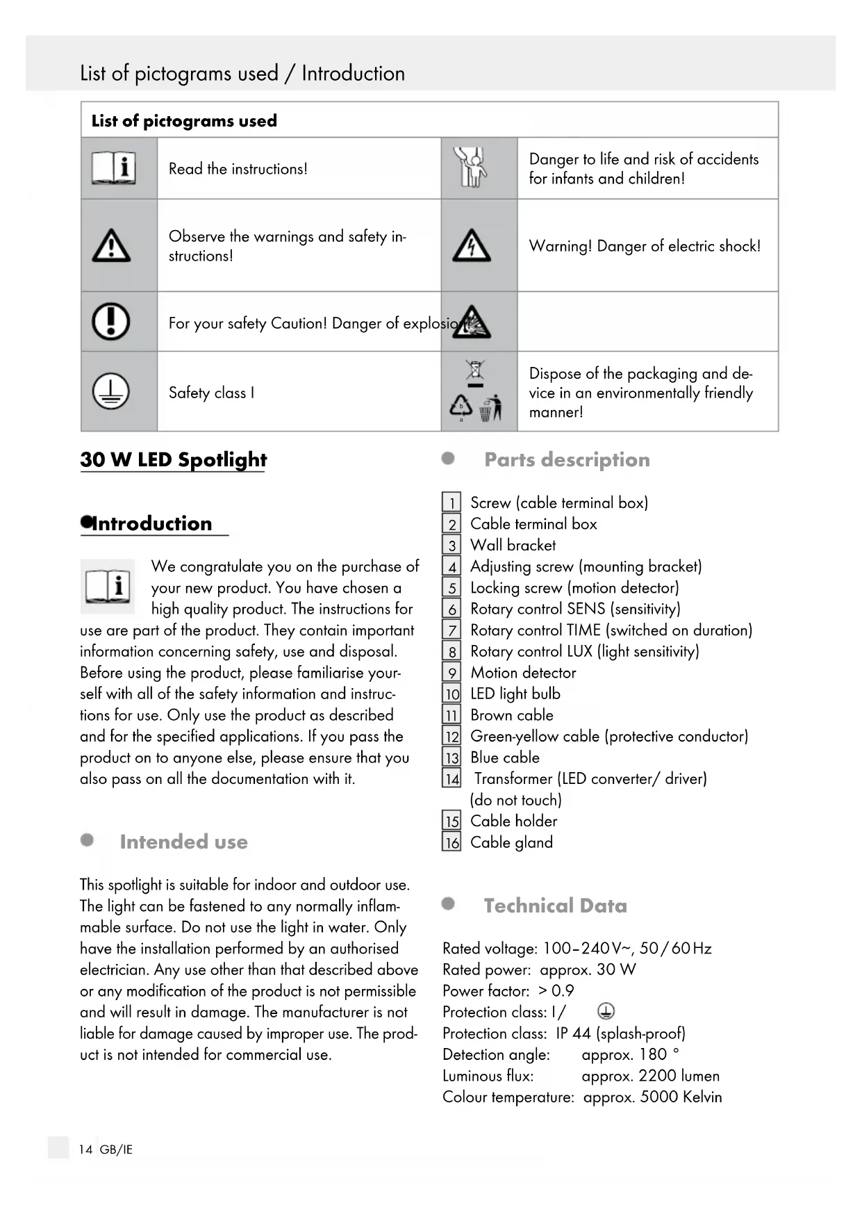 Cable gland Technical Data Rated voltage: 100–240 V∼, 50 / 60 Hz Rated power: approx. 30 W Power factor: > 0.9 Protection class: I / Protection class: IP 44 (splash-proof) Detection angle: approx. 180 ° Luminous flux: approx. 2200 lumen Colour temperature: approx. 5000 Kelvin Introduction / Safety notices15 GB/IE List of pictograms used / Introduction Introduction / Safety notices Switching cycles: approx. 15000 Maximum projected area: 0.045 m