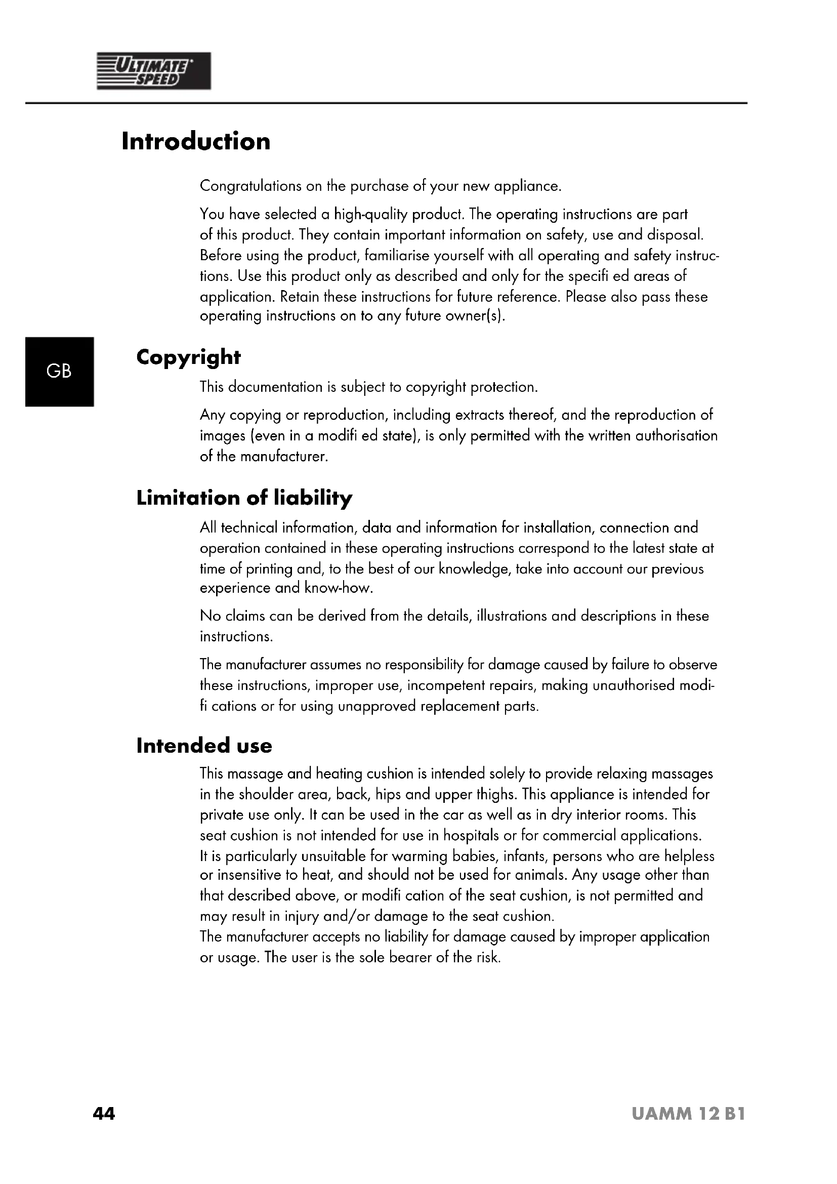 Introduction Congratulations on the purchase of your new appliance. You have selected a high-quality product. The operating instructions are part of this product. They contain important information on safety, use and disposal. Before using the product, familiarise yourself with all operating and safety instruc- tions. Use this product only as described and only for the specifi ed areas of application. Retain these instructions for future reference. Please also pass these operating instructions on to any future owner(s). Copyright This documentation is subject to copyright protection. Any copying or reproduction, including extracts thereof, and the reproduction of images (even in a modifi ed state), is only permitted with the written authorisation of the manufacturer. Limitation of liability All technical information, data and information for installation, connection and operation contained in these operating instructions correspond to the latest state at time of printing and, to the best of our knowledge, take into account our previous experience and know-how. No claims can be derived from the details, illustrations and descriptions in these instructions. The manufacturer assumes no responsibility for damage caused by failure to observe these instructions, improper use, incompetent repairs, making unauthorised modi- fi cations or for using unapproved replacement parts. Intended use This massage and heating cushion is intended solely to provide relaxing massages in the shoulder area, back, hips and upper thighs. This appliance is intended for private use only. It can be used in the car as well as in dry interior rooms. This seat cushion is not intended for use in hospitals or for commercial applications. It is particularly unsuitable for warming babies, infants, persons who are helpless or insensitive to heat, and should not be used for animals. Any usage other than that described above, or modifi cation of the seat cushion, is not permitted and may result in injury and/or damage to the seat cushion. The manufacturer accepts no liability for damage caused by improper application or usage. The user is the sole bearer of the risk. IB_90543_UAMM12B1_LB1.indb 44IB_90543_UAMM12B1_LB1.indb 44 05.09.13 13:0905.09.13 13:0945 UAMM 12 B1