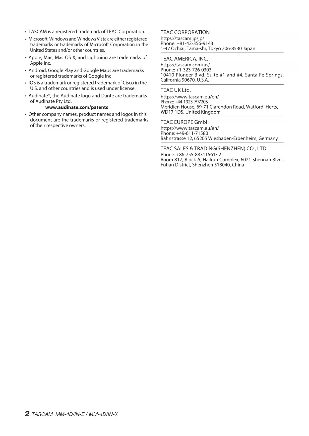 For U.S.A. Declaration of Conformity Model Number: MM-4D/IN-E / MM-4D/IN-XTrade Name: TASCAMResponsible party: TEAC AMERICA, INC.Address: 10410 Pioneer Blvd. Suite #1 and #4, Santa Fe Springs, California 90670, U.S.A.Telephone number: 1-323-726-0303This device complies with Part 15 of the FCC Rules. Operation is subject to the following two conditions: (1) this device may not cause harmful interference, and (2) this device must accept any interference received, including interference that may cause undesired operation.