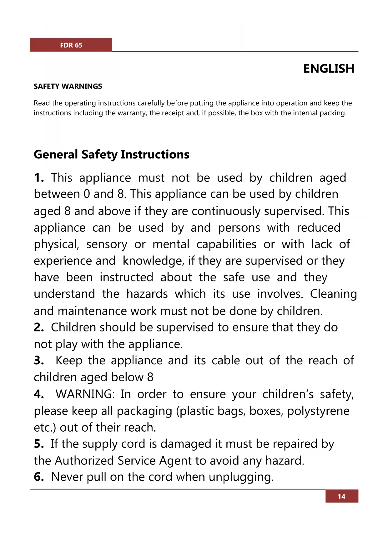 injury. Special Safety Instructions Never let the cord touch hot surfaces or hang down over the worktop edge – a child could grab it and pull the fryer down. After cleaning, ensure all parts are completely dry before use. Never leave your fryer on unattended. Do not use if there is any damage to the fryer, cord or plug. Get it checked or repaired: see ‘service’. Watch out for steam during cooking and when you openFDR 65