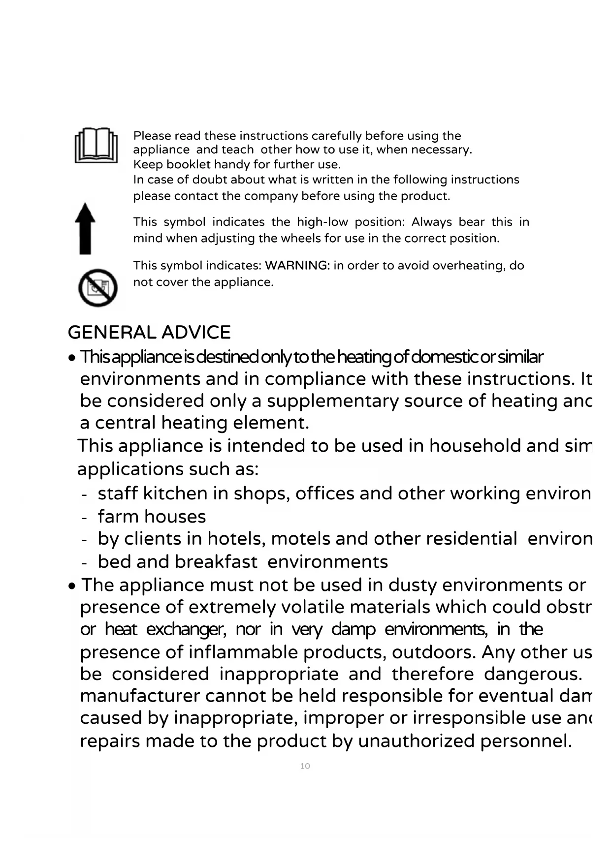 Please read these instructions carefully before using the appliance and teach other how to use it, when necessary. Keep booklet handy for further use. In case of doubt about what is written in the following instructions please contact the company before using the product. This symbol indicates the high-low position: Always bear this in mind when adjusting the wheels for use in the correct position. This symbol indicates: WARNING: in order to avoid overheating, do not cover the appliance. GENERAL ADVICE This appliance is destined only to the heating of domestic or similar environments and in compliance with these instructions. It has to be considered only a supplementary source of heating and not as a central heating element. This appliance is intended to be used in household and similar applications such as: - staff kitchen in shops, offices and other working environments; - farm houses - by clients in hotels, motels and other residential environments - bed and breakfast environments The appliance must not be used in dusty environments or in the presence of extremely volatile materials which could obstruct grids or heat exchanger, nor in very damp environments, in the presence of inflammable products, outdoors. Any other use is to be considered inappropriate and therefore dangerous. The manufacturer cannot be held responsible for eventual damage caused by inappropriate, improper or irresponsible use and/or for repairs made to the product by unauthorized personnel.11 The appliance reaches quite a high temperature when working; contact must be limited to the handle and plastic knobs. Avoid contact with the heating element. Children under 3 years of age should be kept away unless continuously supervised. Children aged between 3 and 8 years shall only switch on/off the appliance only if it has been placed or installed in its intended normal operating position and they have been given supervision or instruction concerning use of the appliance in a safe way and understand the hazards involved. Children aged between 3 and 8 years shall not plug in, regulate and clean the appliance or perform user maintenance. CAUTION: Some parts of this product can become very hot and cause burns. Particular attention has to be given where children and vulnerable people are present. This appliance can be used by children aged 8 or more years. People with reduced physical, sensory or mental capabilities or lack of experience and knowledge can use this appliance only if they have been given supervision or instruction concerning use of the appliance in a safe way and if they understand the hazards involved. Children should not play with the appliance. Cleaning and user maintenance should not be made by children without supervision. Attention: when using electric appliances, the basic safety precautions must always be observed to avoid risks of fire, electric shocks and physical injury. Do not touch the heater with wet hands or feet. Do not expose the heater to the external weather conditions (sun, rain, etc.). Do not move the appliance when it is in function.12 If the appliance should fall over or show signs of faulty operation, disconnect the electrical cable immediately. Check that no part is damaged and switch on after the appliance has been thoroughly checked: in case of doubt, contact qualified professional personnel. Do not pull on the power cord or the appliance to unplug the appliance from the wall socket. Never move the appliance by pulling the cord. Unplug the appliance when not in use. Don’t leave the appliance unattended while it is connected to the supply. Do not move the appliance when it is in function. In order to avoid any risk of electrical shock, never immerse the plug, the mains cable and the appliance in water or in any other liquid. If the supply cord is damaged, it must be replaced by the manufacturer, its service agent or a similarly qualified person in order to avoid hazard. Never use the radiator to dry damp garments. Never use this heater in the immediate surroundings of a bath, a shower or a swimming pool, to prevent any danger of electrical shock, or in any positions where it can be pushed and/or damaged. Never use the appliance in environments smaller than 4 m