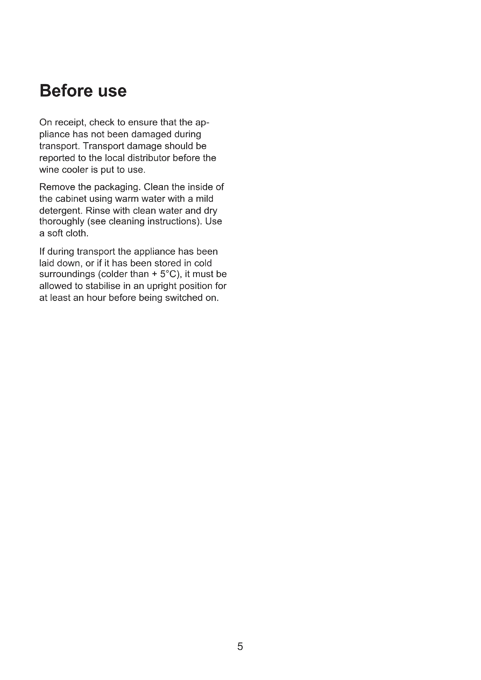 On receipt, check to ensure that the ap- pliance has not been damaged during transport. Transport damage should be reported to the local distributor before the wine cooler is put to use. Remove the packaging. Clean the inside of the cabinet using warm water with a mild detergent. Rinse with clean water and dry thoroughly (see cleaning instructions). Use a soft cloth. If during transport the appliance has been laid down, or if it has been stored in cold surroundings (colder than + 5°C), it must be allowed to stabilise in an upright position for at least an hour before being switched on. Before use6