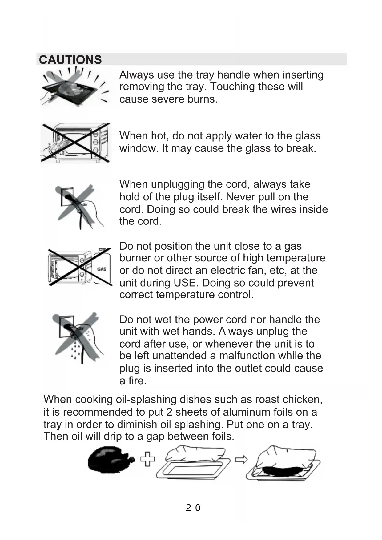year and above and persons with reduced physical, sensory or mental capabilities or lack of experience and knowledge if they have been given supervision or instruction concerning use of the appliance in a safe way and understand the hazards involved. Cleaning and user maintenance shall not be made by children unless they are older than 8 and supervised. This appliance and its cord must be kept out of reach of children less than 8 years. 18CAUTIONS Always use the tray handle when inserting removing the tray. Touching these will cause severe burns. When hot, do not apply water to the glass window. It may cause the glass to break. When unplugging the cord, always take hold of the plug itself. Never pull on the cord. Doing so could break the wires inside the cord. Do not position the unit close to a gas burner or other source of high temperature or do not direct an electric fan, etc, at the unit during USE. Doing so could prevent correct temperature control. Do not wet the power cord nor handle the unit with wet hands. Always unplug the cord after use, or whenever the unit is to be left unattended a malfunction while the plug is inserted into the outlet could cause a re. When cooking oil-splashing dishes such as roast chicken, it is recommended to put 2 sheets of aluminum foils on a tray in order to diminish oil splashing. Put one on a tray. Then oil will drip to a gap between foils. 20USE INDICATION Special indication: the parts and accessory varies from different models. Please refer the image to the real item you buy. The trays are not perfectly square. Note: Be careful when removing pudding and other hot liquids.