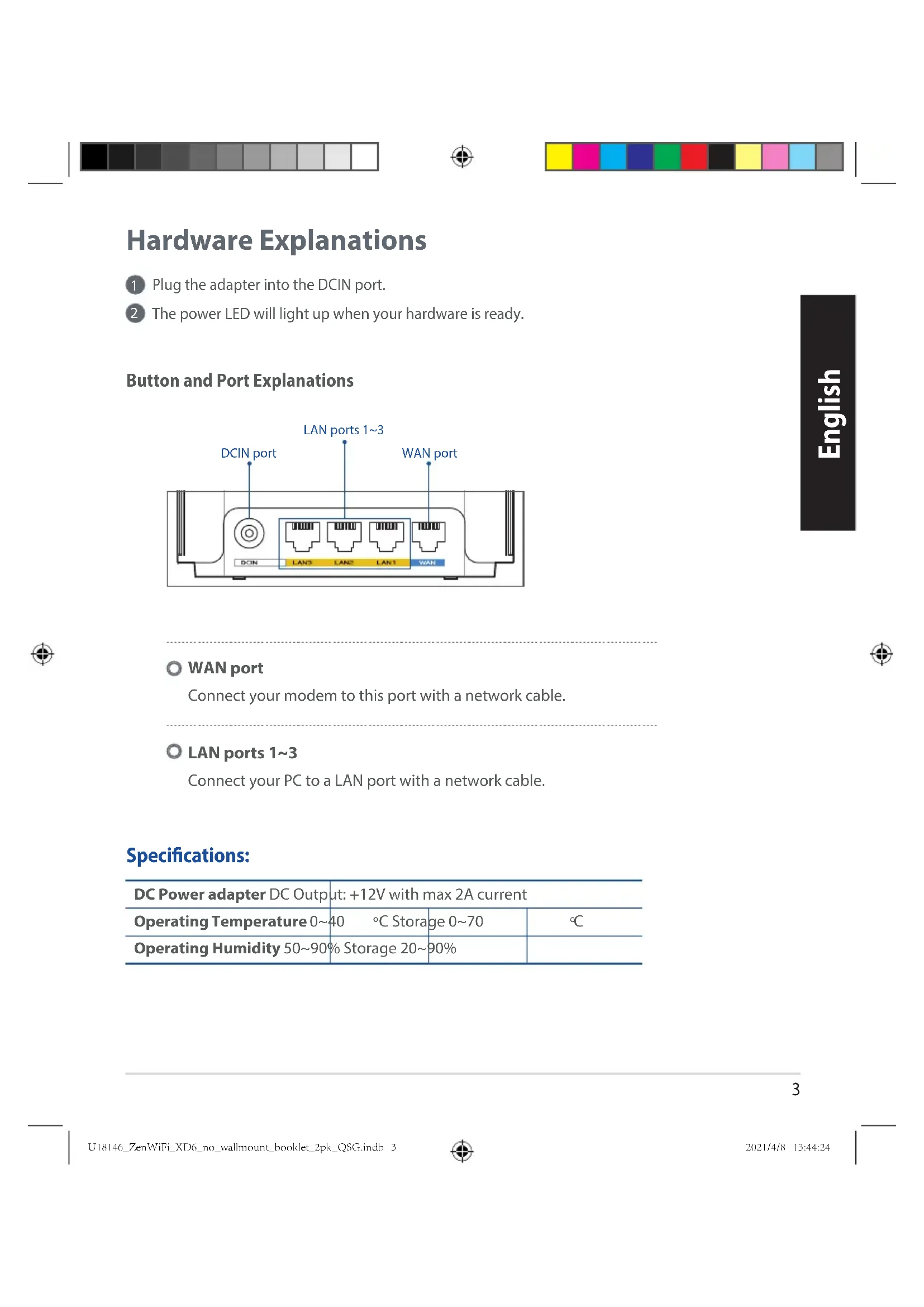 Plug the adapter into the DCIN port. The power LED will light up when your hardware is ready. WAN port Connect your modem to this port with a network cable. LAN ports 1~3 Connect your PC to a LAN port with a network cable.DC Power adapter DC Output: +12V with max 2A currentOperating Temperature 0~40 C Storage 0~70