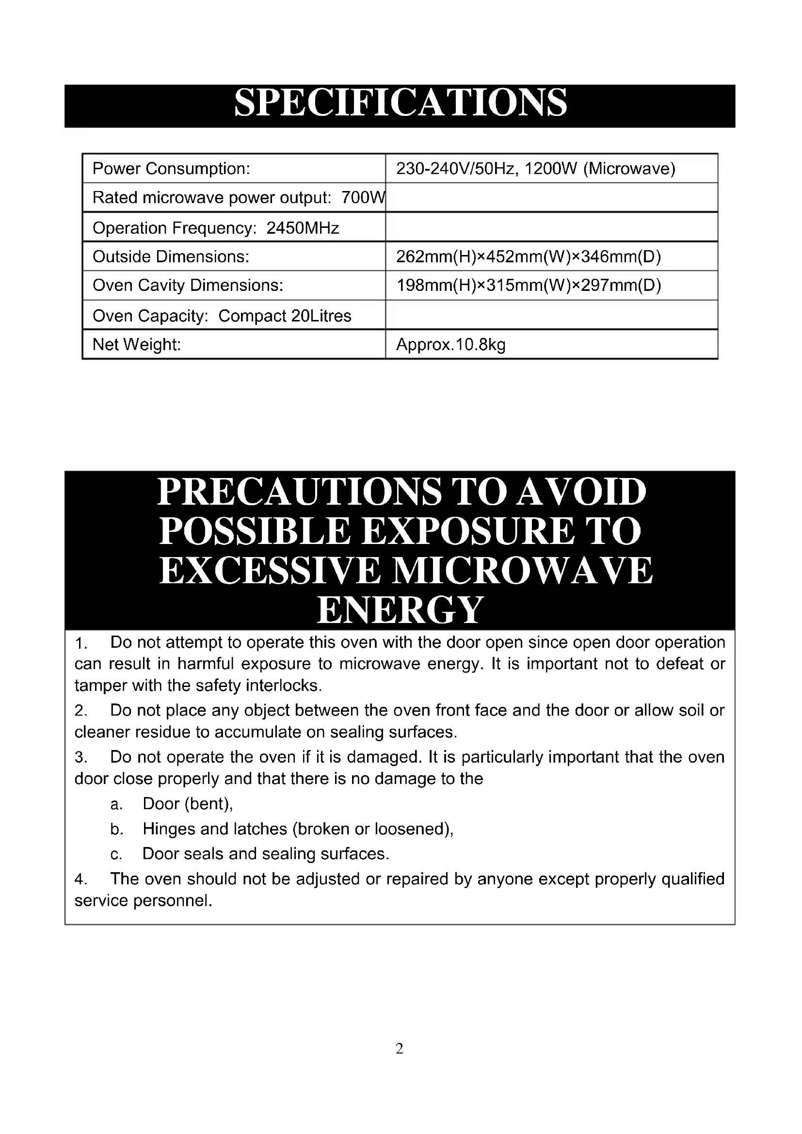 Power Consumption: 230-240V/50Hz, 1200W (Microwave) Rated microwave power output: 700W Operation Frequency: 2450MHz Outside Dimensions: 262mm(H)×452mm(W)×346mm(D) Oven Cavity Dimensions: 198mm(H)×315mm(W)×297mm(D) Oven Capacity: Compact 20Litres Net Weight: Approx.10.8kg