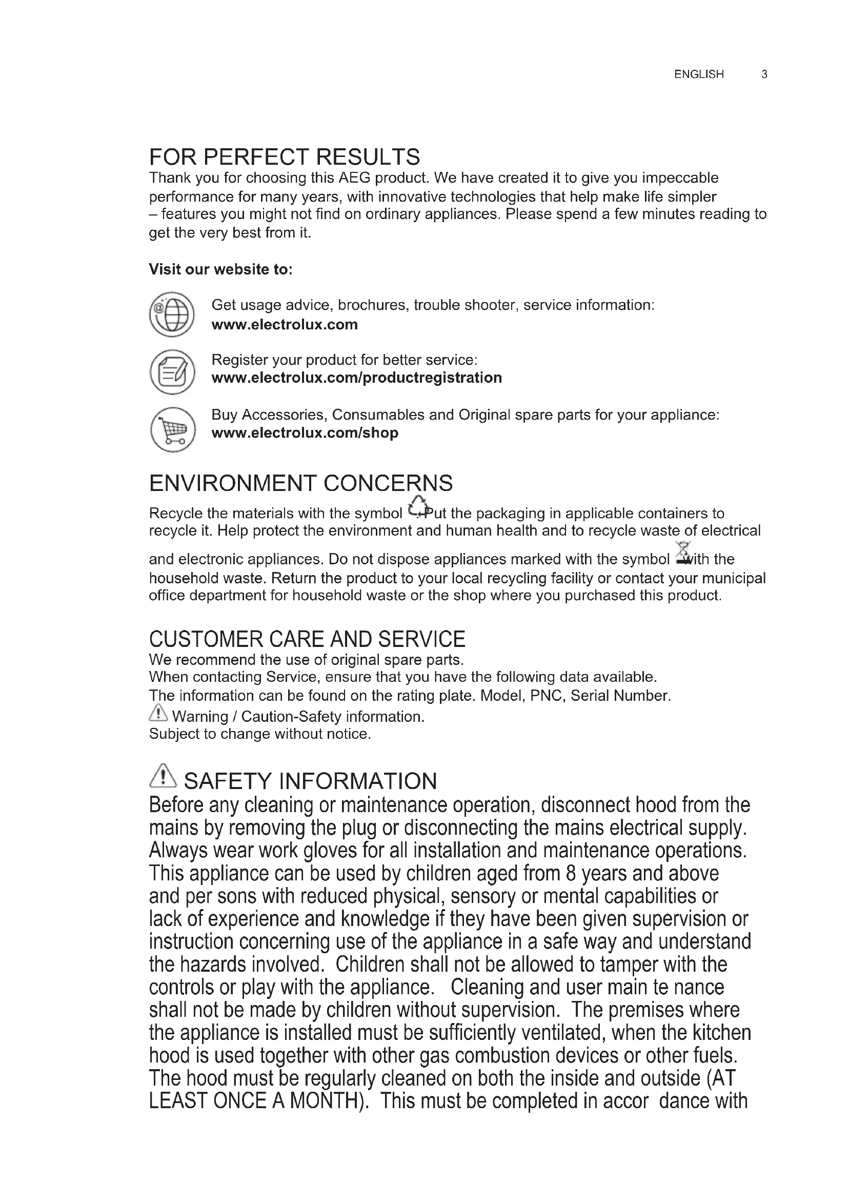 We recommend the use of original spare parts When contacting Service, ensure that you have the following data available The information can be found on the rating plate Model, PNC, Serial Number Warning / Caution-Safety information Subject to change without notice SAFETY INFORMATION Before any cleaning or maintenance operation, disconnect hood from the mains by removing the plug or disconnecting the mains electrical supply. Always wear work gloves for all installation and maintenance operations. This appliance can be used by children aged from 8 years and above and per sons with reduced physical, sensory or mental capabilities or lack of experience and knowledge if they have been given supervision or instruction concerning use of the appliance in a safe way and understand the hazards involved. Children shall not be allowed to tamper with the controls or play with the appliance. Cleaning and user main te nance shall not be made by children without supervision. The premises where the appliance is installed must be sufciently ventilated, when the kitchen hood is used together with other gas combustion devices or other fuels. The hood must be regularly cleaned on both the inside and outside (AT LEAST ONCE A MONTH). This must be completed in accor dance with EN USER MANUALwww.electrolux.com