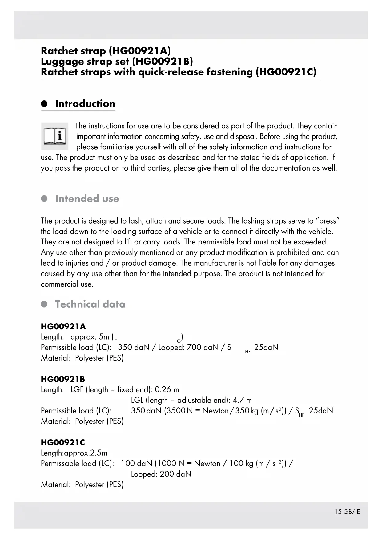 Scope of Delivery Check the delivery for completeness and condition of the product immediately after opening and ensure all parts are included. 1 x Ratchet strap, approx. 5 m (HG00921A) 1 x Lashing strap with ratchet tensioner and S hook, approx. 0.26 m (HG00921B) 1 x Lashing strap with S-hook, approx. 4.7 m (HG00921B) 2 Lashing straps with clamping lock, approx. 2.5 m (HG00921C) 1 x Directions for use