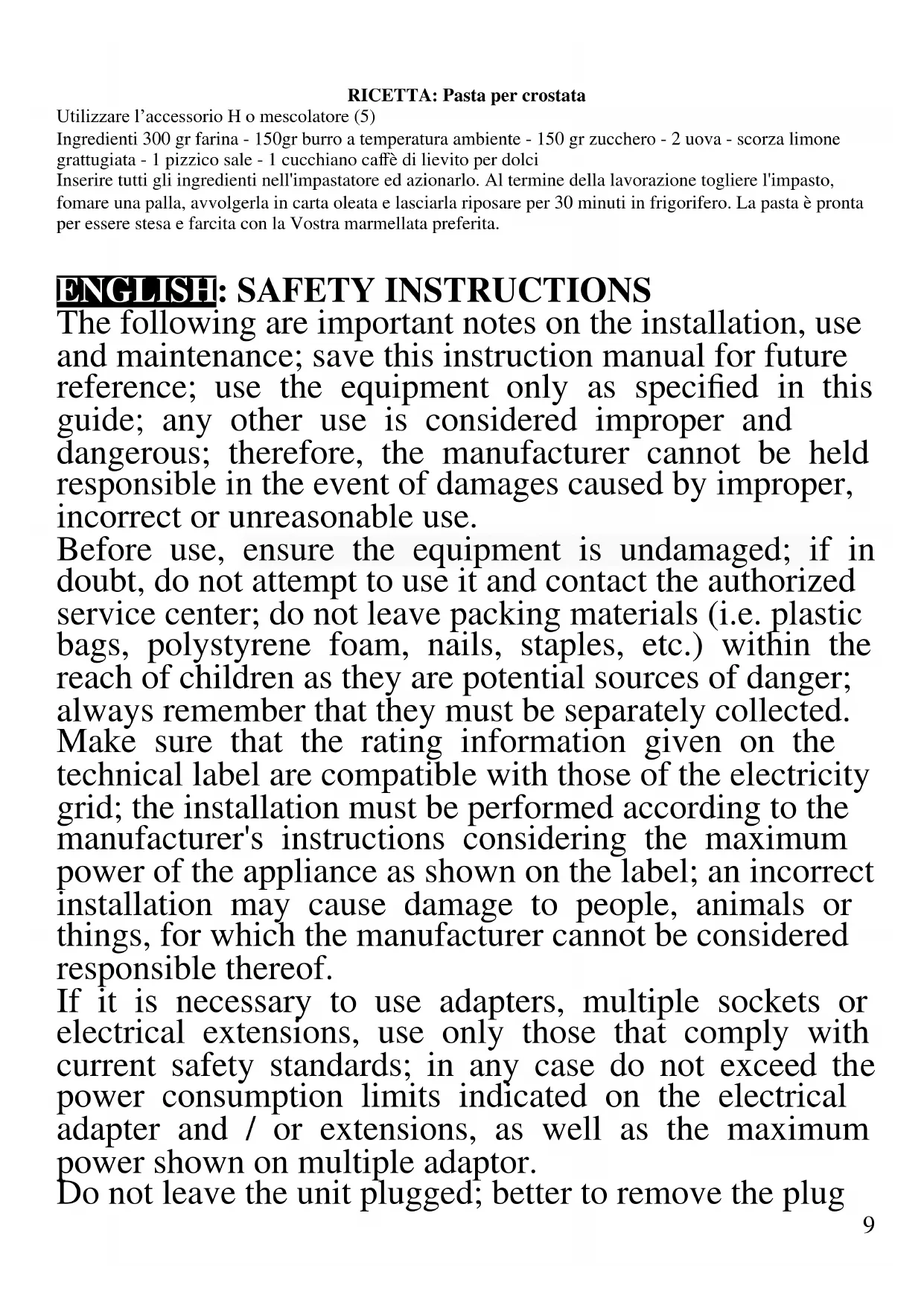 There are three accessories included, to be used depending on the situation. HOOK (6). Use this accessory with hard dough, like bread, pizza, pasta, etc... MIXER (7). Use it with soft dough, such as sweets, or for blending, mixing BEATER (8). Use it for beating eggs or whipping. PASTA, FETTUCCINE and SPAGHETTI MAKER (optional) The pasta maker, the fettuccine maker, and the spaghetti maker attachments are not included in the package and are provided separately. You can order it from your dealer, asking for model IM32 (pasta maker), model IM33 (fettuccine maker), model IM34 (spaghetti maker). Assemble the attachment to the main body (4) by removing the cover (10) in order to discover the gear and fitting it. MEAT GRINDER (optional) The meat grinder attachment is not included in the package and it’s provided separately. It can be ordered from your dealer, asking for model IM31. 1 Meat dish 2 Food pusher 3 Mincer 4 Spiral 5 Blade 6 Thin cut disc 7 Rough cut disc 8 Medium cut disc 9 Ring attachment Assembling the unit: put the spiral (4) inside the mincer (3), the blade (5) on the spiral and one of the discs (6, 7 or 8) over the blade. Choose the disc depending on the kind of chopping you want to obtain. Block the elements by screwing the ring (9). Assemble the dish (1) over the top of mincer (3). In the end, attach meat grinder to the main body (4) by removing the cover (10) in order to discover the gear and fitting the mincer to it. CLEANING - Unplug the unit. Do not immerse the main body in water, only wash it with a damp cloth and non-abrasive detergent. Avoid any infiltration of water inside motor housing. The attachments, the container and the lid cannot be washed in the dishwasher, wash them by hand with non- abrasive sponge and mild detergent. Dry them thoroughly before assembling them to the unit. While washing the mincer blade, be careful not to cut yourself. After having washed the pasta maker, lubricate the rollers with vegetable oil. TECHNICAL FEATURES