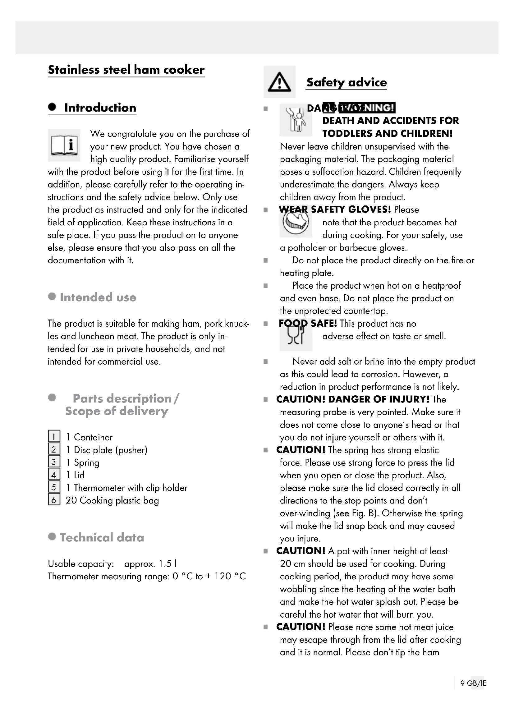 . Push the contents down carefully to avoid air bubbles and seal the product. Boil the product for about 2.5 hours at about 80–90 ° C in hot water. However, always pay attention to the core temperature of the meat that reach 85 °C that means the ham is done. Put the product in cold water to cool and then refrigerate for 12 hours. Cleaning and care Clean and dry thoroughly the product after every time using. Clean the product with warm water and com- mercially available cleaning detergent. For washing the product by hand, use warm water with little ordinary washing-up liquid. Avoid using sharp or pointed objects for this in order not to damage the product. Do not use harsh scouring agents. The product is suitable for the dish- washer (only for container, lid and plate). In time, the minerals in the water could give rise to stains or discolorations on the product. You can get rid of them by rubbing half a lemon over them. More stubborn stains can be removed with a mixture of nine parts water to one part vinegar essence. Note: The thermometer may steam up when it is cooking in the pot. The condensation will slowly clear up the longer it is out of the pot. Disposal The packaging is made entirely of recyclable mate- rials, which you may dispose of at local recycling facilities. Contact your local refuse disposal authority for more details of how to dispose of your worn-out product. Warranty The product has been manufactured to strict quality guidelines and meticulously examined before deliv- ery. In the event of product defects you have legal rights against the retailer of this product. Your legal rights are not limited in any way by our warranty detailed below.12 GB/IE The warranty for this product is 3 years from the d ate of purchase. Should this product show any fault in materials or manufacture within 3 years from the date of purchase, we will repair or replace it – at our choice – free of charge to you. The warranty period begins on the date of purchase. Please keep the original sales receipt in a safe loca- tion. This document is required as your proof of pur-