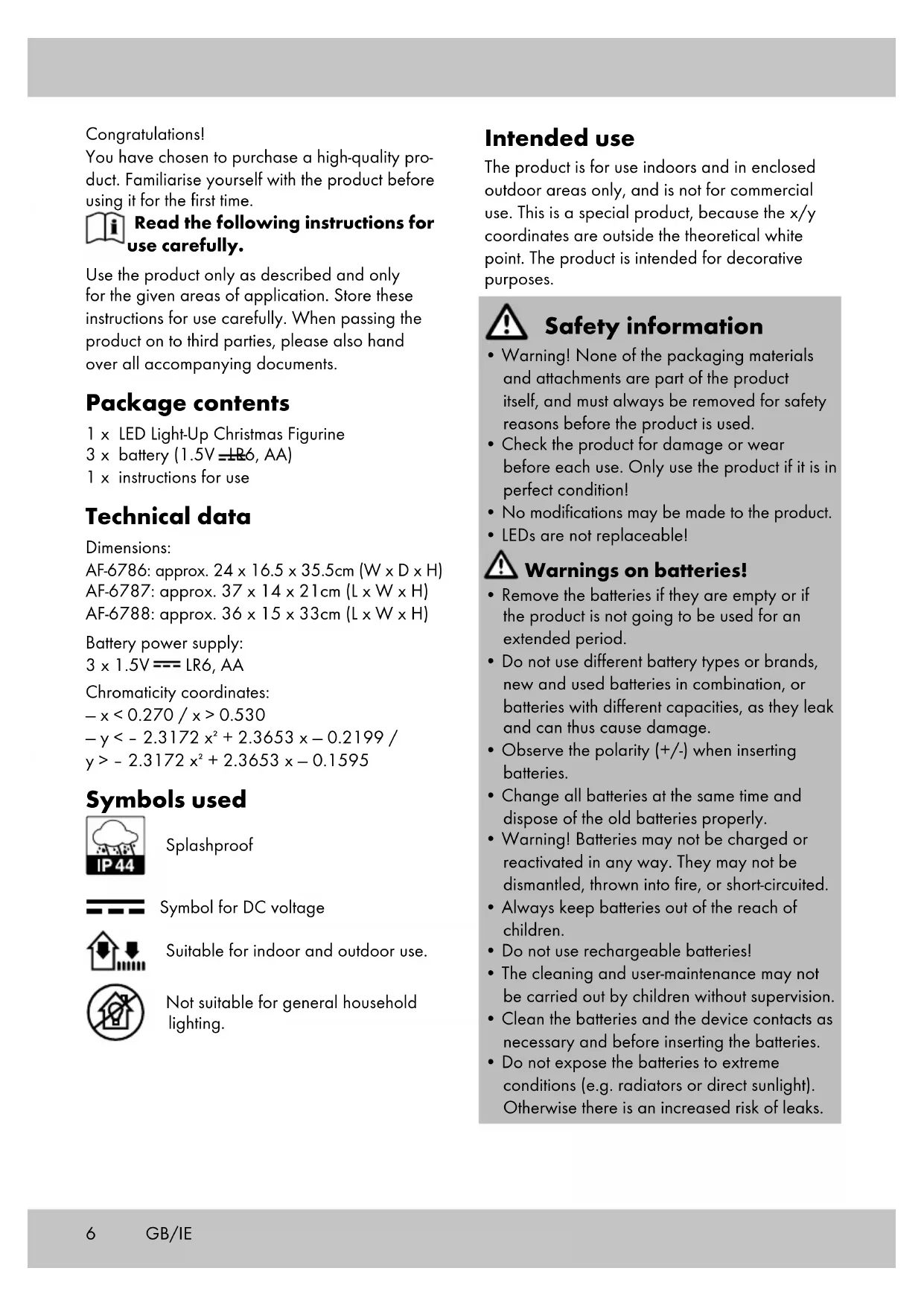 Replacing the batteries When the batteries (2) are flat, you can replace them. Follow the instruction in the section “Inserting the batteries”. Before inserting new batteries, remove the old batteries from the battery com- partment. Turning the light on and off (fig. B) Push the button (1c) once to activate the product’s timer function. Note: When the timer function is activated the light will turn on for 6 hours and off for 18 hours. This rhythm repeats daily. Push the button (1c) twice to turn the product on. Push the button (1c) three times to turn the product off. Note: Within each activated mode, you must only push the button once to switch to the next mode. Use The product can be placed indoors or in an enclosed outdoor area. Note: Do not place the product on delicate surfaces. This can lead to scratches. Storage, cleaning When not in use, always store the product dry, clean, without batteries and at room temperature. Only clean the product with a damp cloth and wipe dry afterwards. IMPORTANT! Never clean the product with harsh cleaning agents. Disposal In the interest of protecting the environment, do not throw your product into the household waste once you are finished with it, but rather take it to a specialty disposal facility. Find out about collection sites and their hours of operation from your local authority. Defective or used batteries must be recycled pursuant to Directive 2006/66/EC and changes to it. Return batteries and/or the product via the collecting sites provided. Packaging materials, such as plastic bags, must be kept away from children. Keep the packaging materials out of reach of children. Environmental damage caused by improper disposal of batteries! Batteries may not be disposed of with household waste. They may contain toxic heavy metals and are subject to hazardous waste treatment. The chemical symbols of the heavy metals are as follows: Cd = cadmium, Hg = mercury, Pb = lead. Dispose of used batteries at a municipal collection site. GB/IE8 Dispose of the product and packaging in an environmentally friendly manner. Note the label on the packaging materials when separating waste, as these are labelled with abbreviations (a) and numbers (b) with the following meaning: 1–7: plastics/20–22: paper and cardboard/80–98: composite materials. The product and the packaging materials can be recycled, dispose of them separately for better treatment of waste. The Triman logo only applies to France. Find out how to dispose of the used product from your municipal or city administration. Notes on the guarantee and service handling The product was produced with great care and under constant supervision. You receive a three- year warranty for this product from the date of purchase. Please retain your receipt. The warranty applies only to material and work- manship and does not apply to misuse or impro- per handling. Your statutory rights, especially the warranty rights, are not affected by this warranty. With regard to complaints, please contact the following service hotline or contact us by e-mail. Our service employees will advise as to the subsequent procedure as quickly as possible. We will be personally available to discuss the situation with you. Any repairs under the warranty, statutory gua- rantees or through goodwill do not extend the warranty period. This also applies to replaced and repaired parts. Repairs after the warranty are subject to a charge. IAN: 323267_1901 Service Great Britain Tel.: 0800 404 7657 E-Mail: deltasport@lidl.co.uk Service Ireland Tel.: 890 930 034 (0,08 EUR/Min., (peak)) (0,06 EUR/Min., (off peak)) E-Mail: deltasport@lidl.ie GB/IE9 Félicitations ! Vous venez d’acquérir un article de grande qualité. Avant la première utilisation, familiari- sez-vous avec l’article. Pour cela, veuillez lire attentive- ment la notice d’utilisation sui- vante. Utilisez l’article uniquement comme indiqué et pour les domaines d’utilisation mentionnés. Conservez bien cette notice d’utilisation. Si vous cédez l’article à un tiers, veillez à lui remettre l’ensemble de la documentation. Étendue de la livraison 1 figurine décorative LED 3 piles (1,5 V LR6, AA) 1 notice d’utilisation Caractéristiques techniques Dimensions : AF-6786 : env. 24 x 16,5 x 35,5 cm (l x p x h) AF-6787 : env. 37 x 14 x 21 cm (L x l x h) AF-6788 : env. 36 x 15 x 33 cm (L x l x h) Alimentation en énergie à piles : 3 x 1,5 V LR6, AA Coordonnées chromatiques : — x < 0,270 / x > 0,530 — y < – 2,3172 x + 2,3653 x — 0,2199 / y > – 2,3172 x + 2,3653 x — 0,1595 Pictogrammes utilisés Protection contre les projections d’eau. Symbole de tension continue. Adapté à l’intérieur et l’extérieur. Ne convient pas pour l’éclairage général de pièces de la maison. Utilisation conforme à sa destination L’article est uniquement destiné à un usage domestique à l’intérieur et à l’extérieur protégé et non pour une utilisation commerciale. Cet article est un produit spécial, parce que les coordonnées x/y se situent en dehors du point blanc théorique. L’article est utilisé à des fins décoratives. Consignes de sécurité