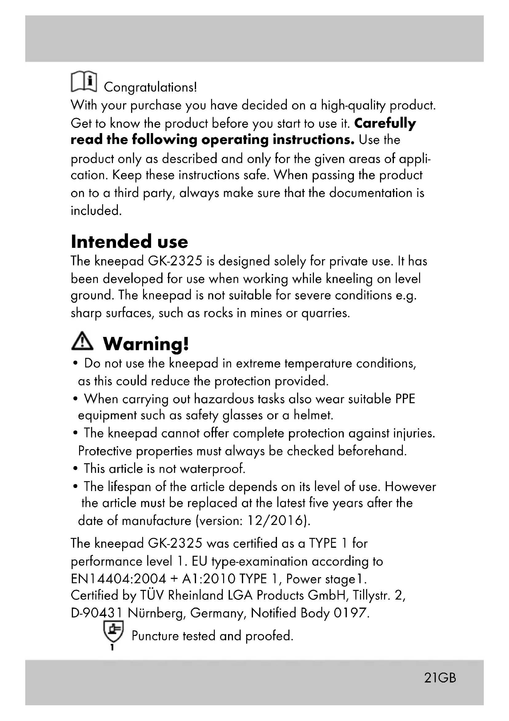 - The lifespan of the article depends on its level of use. However the article must be replaced at the latest five years after the date of manufacture (version: 12/2016). The kneepad GK-2325 was certified as a TYPE 1 for performance level 1. EU type-examination according to EN14404:2004 + A1:2010 TYPE 1, Power stage1. Certified by TÜV Rheinland LGA Products GmbH, Tillystr. 2, D-90431 Nürnberg, Germany, Notified Body 0197.