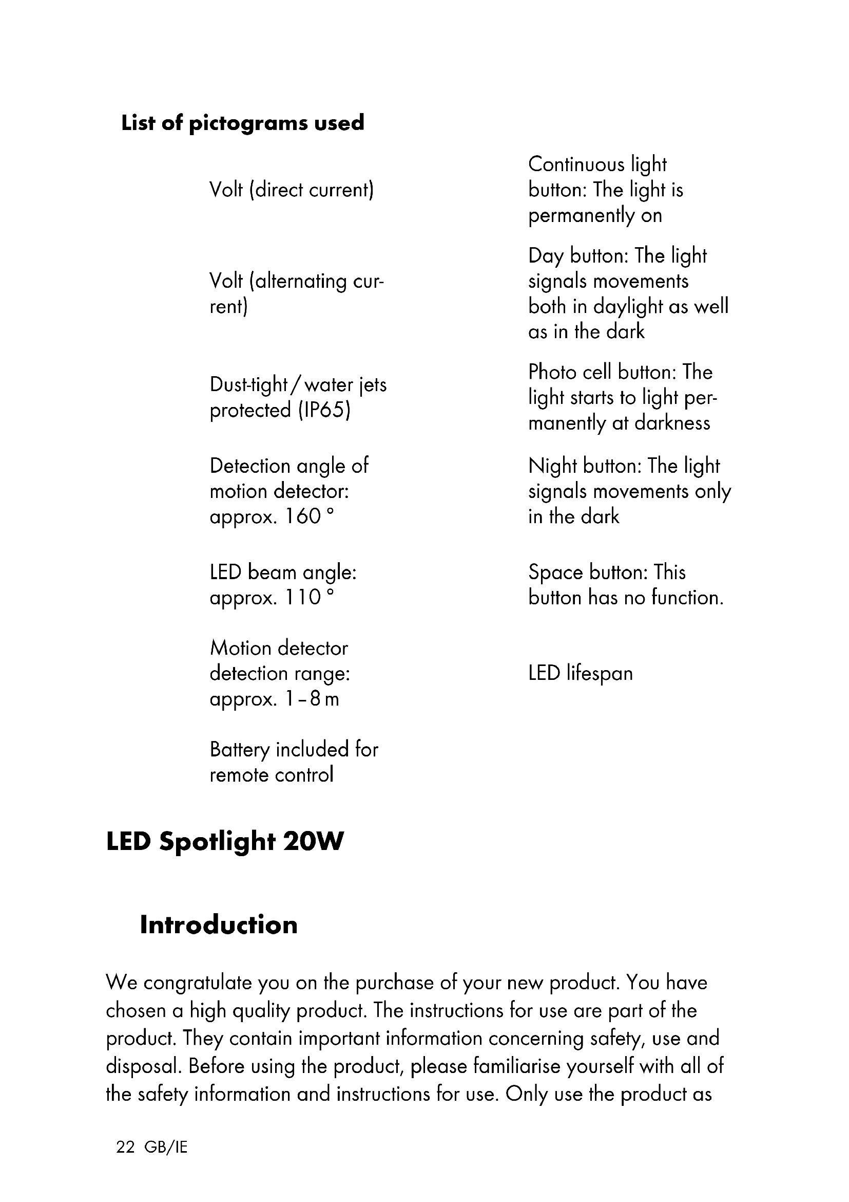 Spring washer Technical data Operating voltage: 230 V∼ 50 Hz Total power consumption: 20 W Illuminant (COB LED): 20 W (non-replaceable)24 GB/IE Motion sensor: Range: max. 8 m (adjustable), detection angle: approx. 160 ° horizontal Protection class: I Degree of protection: IP65 (dust-tight / water jets protected) Weight: approx. 640 g Overall dimension: 18 x 12.5 x 8 cm Projected area: max. 18 x 12.5 cm Mounting height: approx. 1.8–2.5 m GS certified Remote control Power supply: 3 V Battery: 1 x 3 V ; Type: CR2025 Lithium battery Operation range: approx. 12 m from the product Scope of delivery Check immediately after unpacking that the parts are complete and that the product is in proper condition. 1 LED spotlight 2 Wall plugs (Ø 8 mm) 2 Screws (Ø 5 x 50 mm) 1 Bracket 2 Tooth lock washers 2 Flat washers 2 Spring washers 2 Locking screws 1 Terminal cover 1 Cable gland 1 Remote control 1 Lithium battery, type CR2025 (pre-installed) 1 Instructions for use25 GB/IE General safety instructions BEFORE USING THE PRODUCT, PLEASE FAMILIARISE YOURSELF WITH ALL OF THE SAFETY INFORMATION AND INSTRUCTIONS FOR USE! WHEN PASSING THIS PRODUCT ON TO OTHERS, PLEASE ALSO INCLUDE ALL THE DOCUMENTS! DANGER TO LIFE AND ACCIDENT HAZARD FOR TODDLERS AND SMALL CHILDREN! Never leave children unattended with the packaging material. The packaging material represents a danger of suffocation. Children fre- quently underestimate the dangers. Please keep the product out of the reach of children at all times. This product may be used by children age 8 years and up, as well as by persons with reduced physical, sensory or mental capacities, or lacking experience and / or knowledge, so long as they are supervised or instructed in the safe use of the product and understand the associ- ated risks. Children should not be allowed to play with the product. Cleaning and user maintenance should not be performed by children without supervision. DANGER OF SUFFOCATION! Children could swallow on small included parts (e.g. screws). Keep children away from the work area during assembly. The illuminants are not replaceable. If the illuminants fail at the end of their lives, the entire product must be replaced. Only to be installed outside arm reach. Danger to life by electric shock Always check the product for damage before connecting it to the mains. Never use the product if it shows any signs of damage.26 GB/IE Prior to installation, verify that the mains voltage on site corresponds with the operating voltage required for the product (230 V∼ 50 Hz). Otherwise do not install the product. CAUTION! DANGER OF BURN INJURIES! To prevent burns, verify the product is switched off and has cooled down for at least 15 min before touching it. The product can become very hot. 1 .0 m FIRE HAZARD! Fit the product so that it is at least