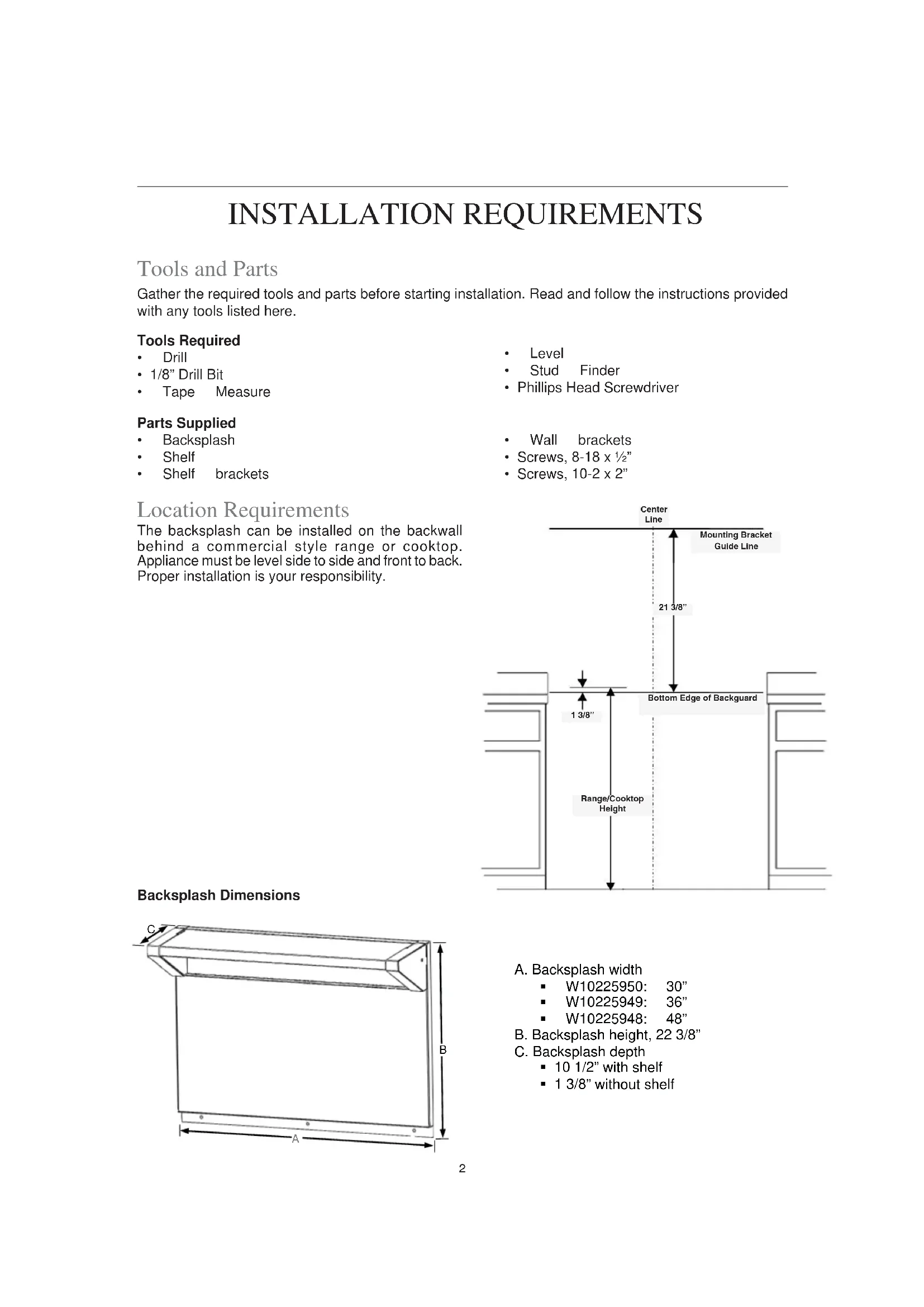 - Tape Measure Location Requirements The backsplash can be installed on the backwall behind a commercial style range or cooktop. Appliance must be level side to side and front to back. Proper installation is your responsibility. Backsplash Dimensions