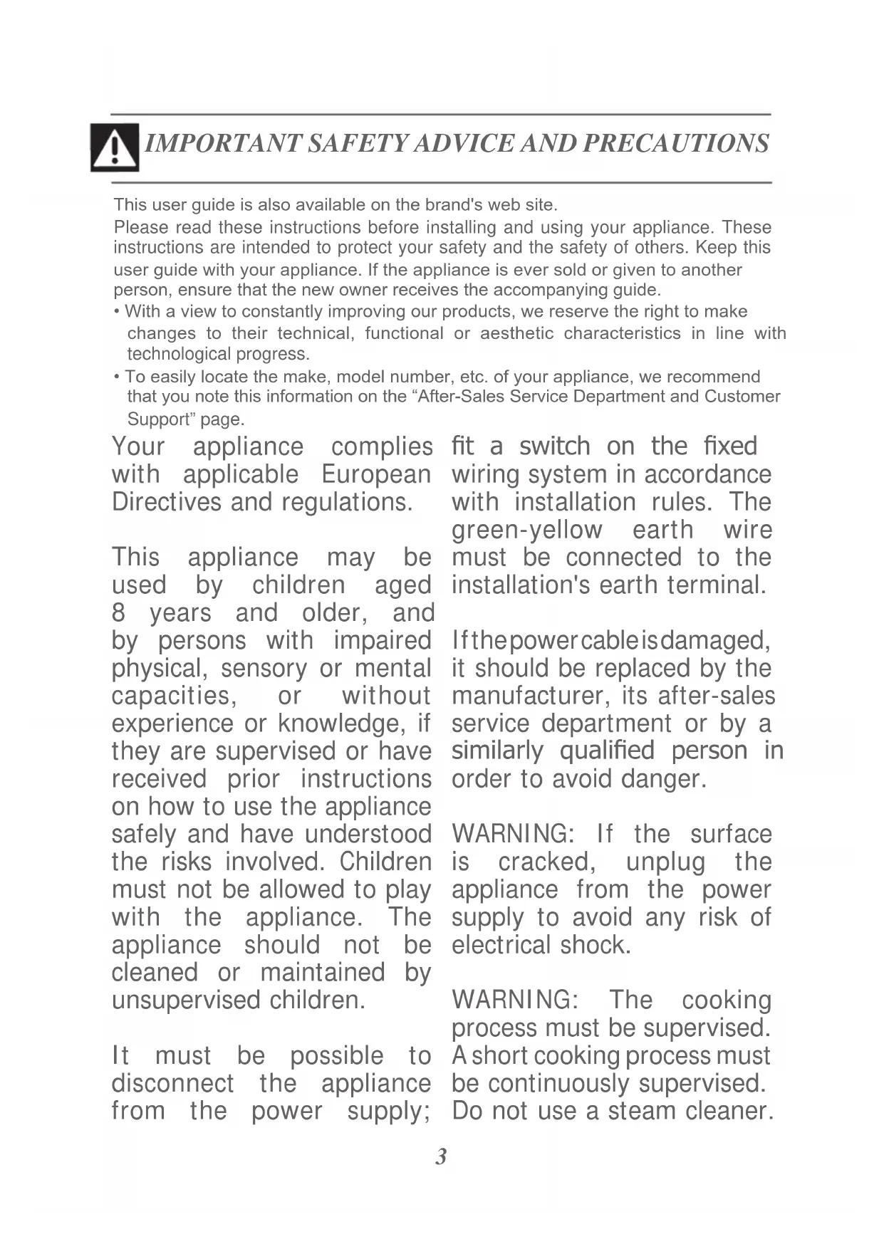 - To easily locate the make, model number, etc. of your appliance, we recommend that you note this information on the “After-Sales Service Department and Customer Support” page. Your appliance complies with applicable European Directives and regulations. This appliance may be used by children aged 8 years and older, and by persons with impaired physical, sensory or mental capacities, or without experience or knowledge, if they are supervised or have received prior instructions on how to use the appliance safely and have understood the risks involved. Children must not be allowed to play with the appliance. The appliance should not be cleaned or maintained by unsupervised children. It must be possible to disconnect the appliance from the power supply; t a switch on the xed wiring system in accordance with installation rules. The green-yellow earth wire must be connected to the installation's earth terminal. If the power cable is damaged, it should be replaced by the manufacturer, its after-sales service department or by a similarly qualied person in order to avoid danger.