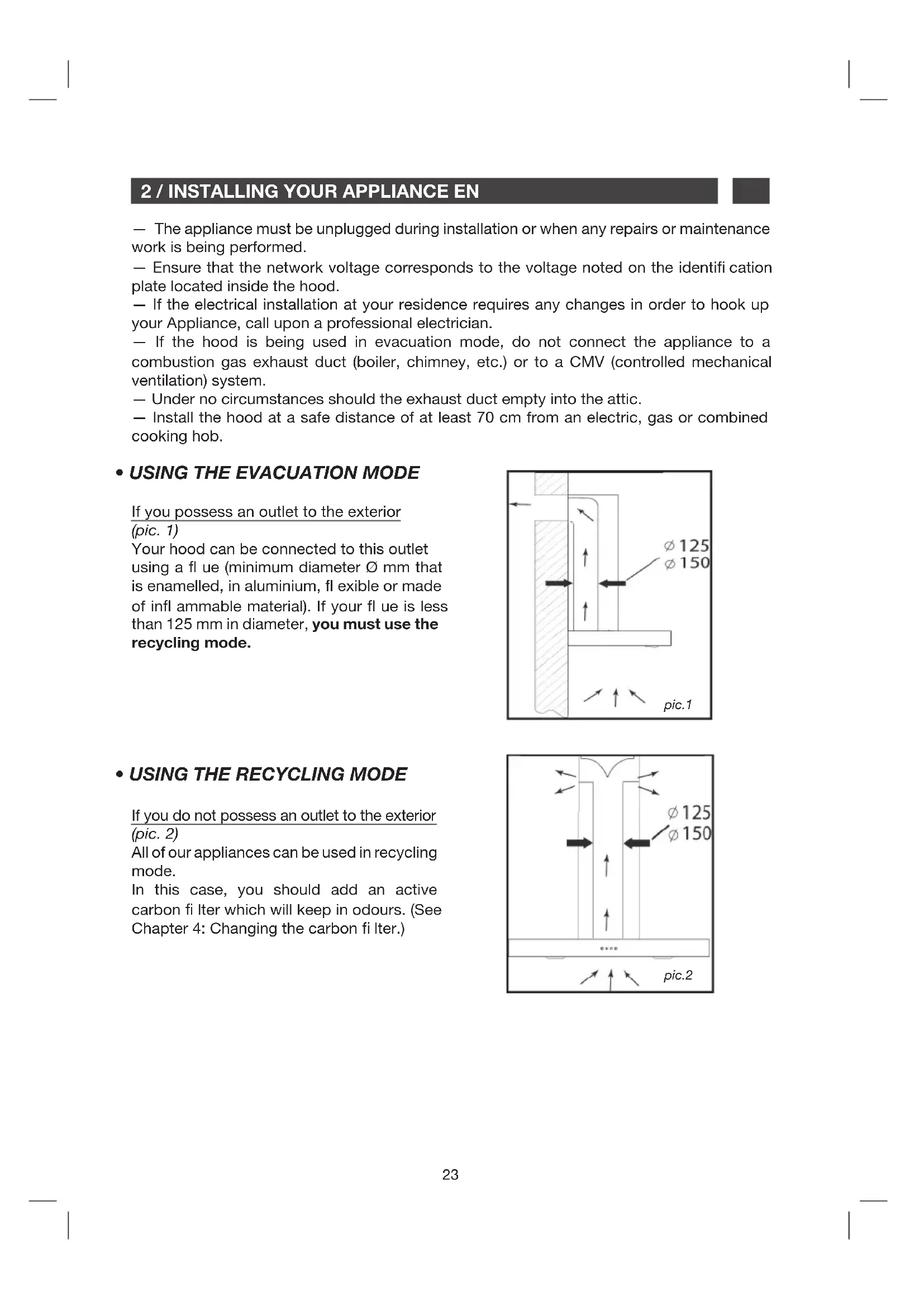 - USING THE RECYCLING MODE If you possess an outlet to the exterior (pic. 1) Your hood can be connected to this outlet using a ue (minimum diameter Ø mm that is enamelled, in aluminium, exible or made of in ammable material). If your ue is less than 125 mm in diameter, you must use the recycling mode. If you do not possess an outlet to the exterior (pic. 2) All of our appliances can be used in recycling mode. In this case, you should add an active carbon lter which will keep in odours. (See
