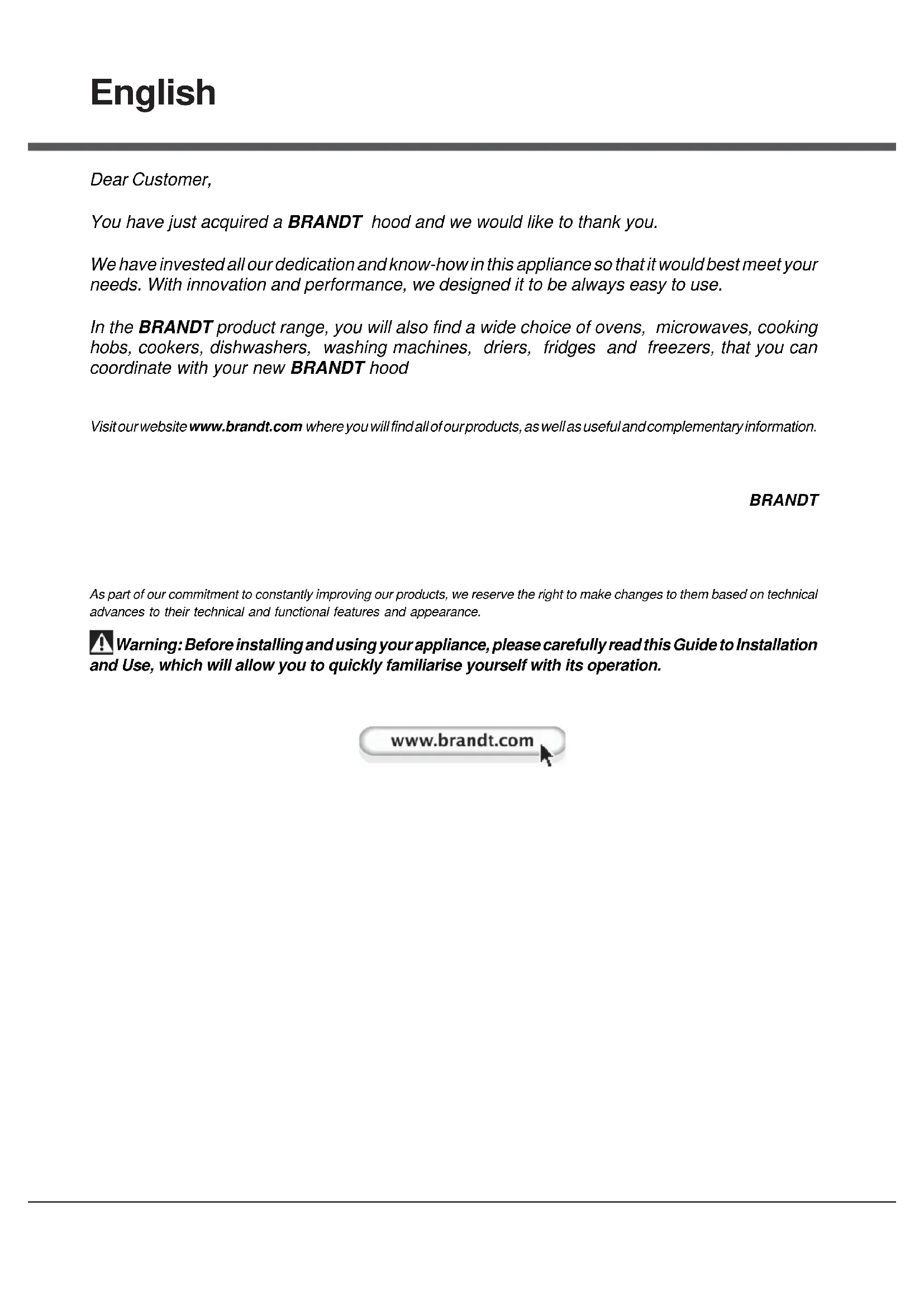 PEnglish Dear Customer, You have just acquired a BRANDT hood and we would like to thank you. We have invested all our dedication and know-how in this appliance so that it would best meet your needs. With innovation and performance, we designed it to be always easy to use. In the BRANDT product range, you will also find a wide choice of ovens, microwaves, cooking hobs, cookers, dishwashers, washing machines, driers, fridges and freezers, that you can coordinate with your new BRANDT hood Visit our website www.brandt.com where you will find all of our products, as well as useful and complementary information. BRANDT As part of our commitment to constantly improving our products, we reserve the right to make changes to them based on technical advances to their technical and functional features and appearance.
