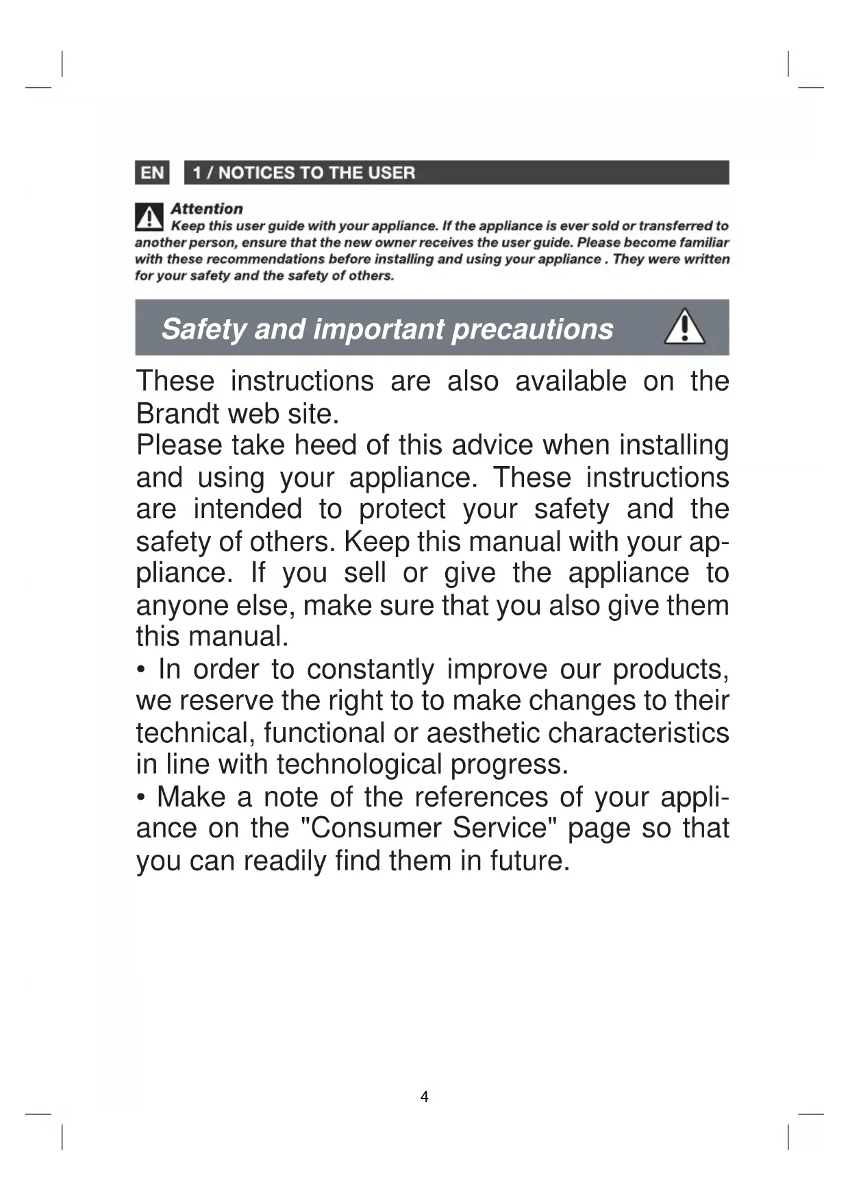 3Safety and important precautions These instructions are also available on the Brandt web site. Please take heed of this advice when installing and using your appliance. These instructions are intended to protect your safety and the safety of others. Keep this manual with your ap- pliance. If you sell or give the appliance to anyone else, make sure that you also give them this manual.