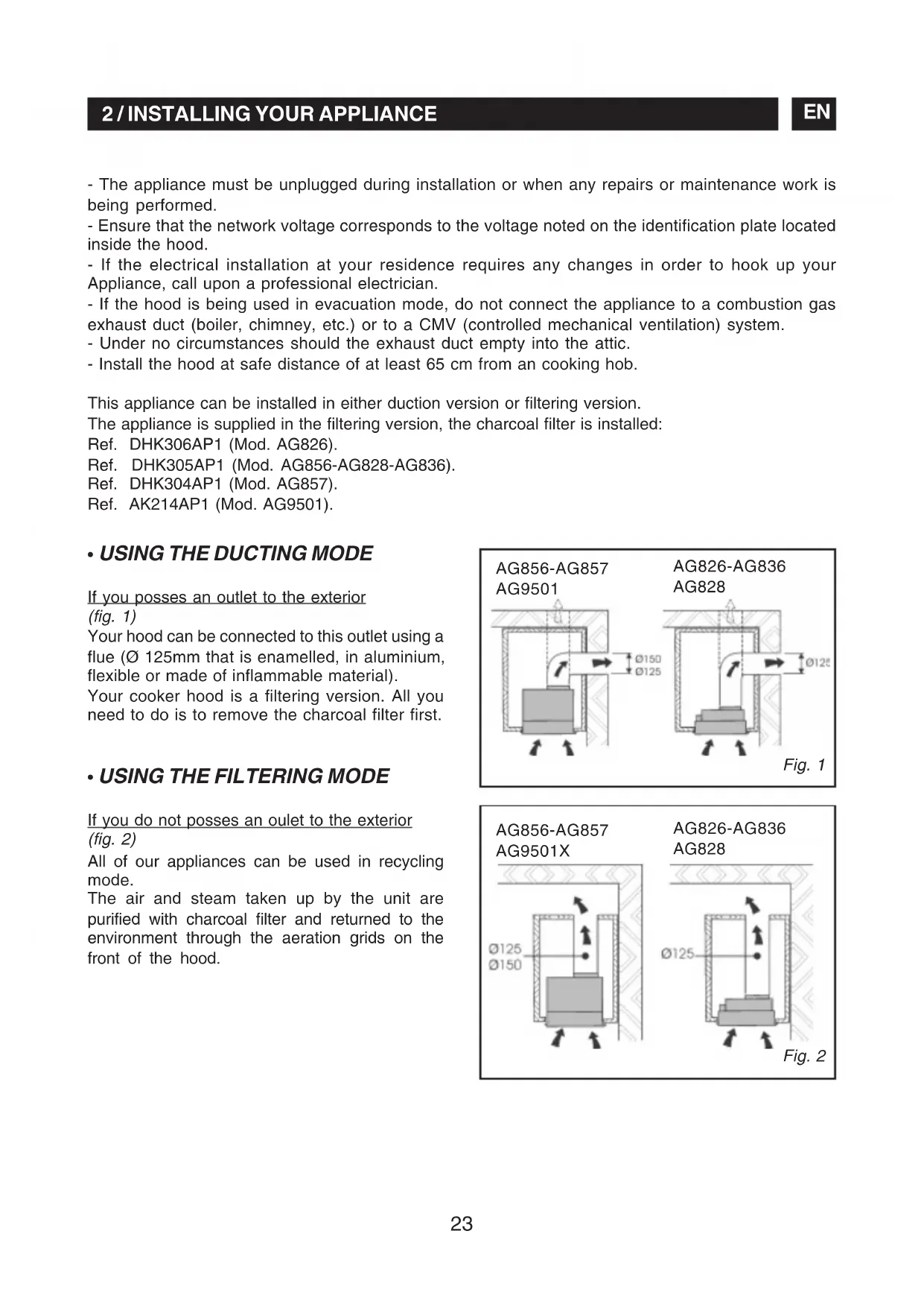 AG826 AG836 AG828 AG856 AG857 AG950123 - The appliance must be unplugged during installation or when any repairs or maintenance work is being performed. - Ensure that the network voltage corresponds to the voltage noted on the identification plate located inside the hood. - If the electrical installation at your residence requires any changes in order to hook up your Appliance, call upon a professional electrician. - If the hood is being used in evacuation mode, do not connect the appliance to a combustion gas exhaust duct (boiler, chimney, etc.) or to a CMV (controlled mechanical ventilation) system. - Under no circumstances should the exhaust duct empty into the attic. - Install the hood at safe distance of at least 65 cm from an cooking hob. This appliance can be installed in either duction version or filtering version. The appliance is supplied in the filtering version, the charcoal filter is installed: Ref. DHK306AP1 (Mod. AG826). Ref. DHK305AP1 (Mod. AG856-AG828-AG836). Ref. DHK304AP1 (Mod. AG857). Ref. AK214AP1 (Mod. AG9501).