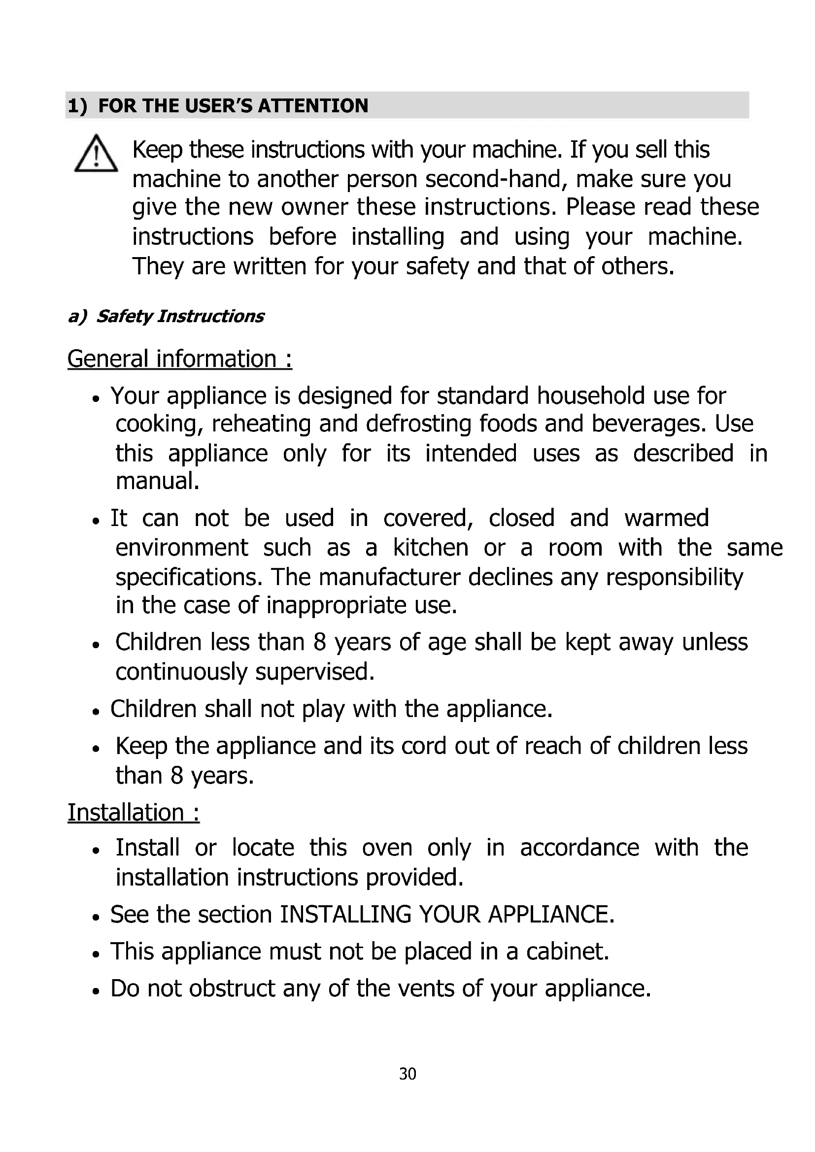 Keep these instructions with your machine. If you sell this machine to another person second-hand, make sure you give the new owner these instructions. Please read these instructions before installing and using your machine. They are written for your safety and that of others. a) Safety Instructions General information : Your appliance is designed for standard household use for cooking, reheating and defrosting foods and beverages. Use this appliance only for its intended uses as described in manual. It can not be used in covered, closed and warmed environment such as a kitchen or a room with the same specifications. The manufacturer declines any responsibility in the case of inappropriate use. Children less than 8 years of age shall be kept away unless continuously supervised. Children shall not play with the appliance. Keep the appliance and its cord out of reach of children less than 8 years. Installation : Install or locate this oven only in accordance with the installation instructions provided. See the section INSTALLING YOUR APPLIANCE. This appliance must not be placed in a cabinet. Do not obstruct any of the vents of your appliance.31 If this equipment is covered or touching flammable material, including curtains, drapes items with a similar nature there is a risk of fire during the use. Keep cord away from heated surface, and do not cover any events on the oven. The appliance is not intended to be operated by means of an external timer or separate remote- control system. Use: The appliance and its accessible parts become hot during use. Liquids and other foods should not be heated in sealed containers because they may explode. This appliance can be used by children aged from 8 years and above and persons with reduced physical, sensory or mental capabilities or lack of experience and knowledge if they have been given supervision or instruction concerning use of the appliance in a safe way and understand the hazards involved. The appliance and its accessible parts become hot during use. Children less than 8 years of age shall be kept away unless continuously supervised. Do not place anything on the appliance during operation. Ensure that the cookware is suitable for use in a microwave oven. Always use oven mitts to remove dishes from the oven. Some dishes absorb the heat of foods and, therefore, are very hot.32 For the microwave and microwave + circular heating functions, the use of metallic cookware is not recommended Remove wire twist- ties and metal handles from paper or plastic containers/bags before placing them in the oven. To avoid damaging your appliance, never operate it while empty or without the turn-table. In the case of small quantities (a sausage, a croissant, etc.) place a glass of water next to the food. Heating beverages in the microwave oven can cause sudden and/or delayed splattering of boiling liquid, so precautions must be taken when handling their containers. The contents of baby bottles and baby food jars should be shaken or stirred and their temperature checked before consumption to avoid burns. Never heat a baby bottle with the nipple on (risk of explosion It is recommended that you avoid heating eggs in their shells and whole hard-boiled eggs in the microwave oven because they run the risk of explosion, even after cooking is complete. Do not use aluminium cooking foil to cover food. Do not cover part of the oven with aluminium foil. While heating food items in plastic or paper containers, monitor the microwave's contents for there is a risk of spontaneous combustion. If smoke is emitted, switch off or unplug the appliance and keep the door closed in order to stifle any flames. The cookware not recommended by the manufacturer may result in hazardous situations and injuries.33 Do not use the oven cavity for storage purposes. Do not store items, such as bread, cookies, etc. inside the oven Cleaning : Failure to maintain the oven in a clean condition could lead to deterioration of the surface, that could adversely affect the life of the appliance and possibly result in a hazardous.