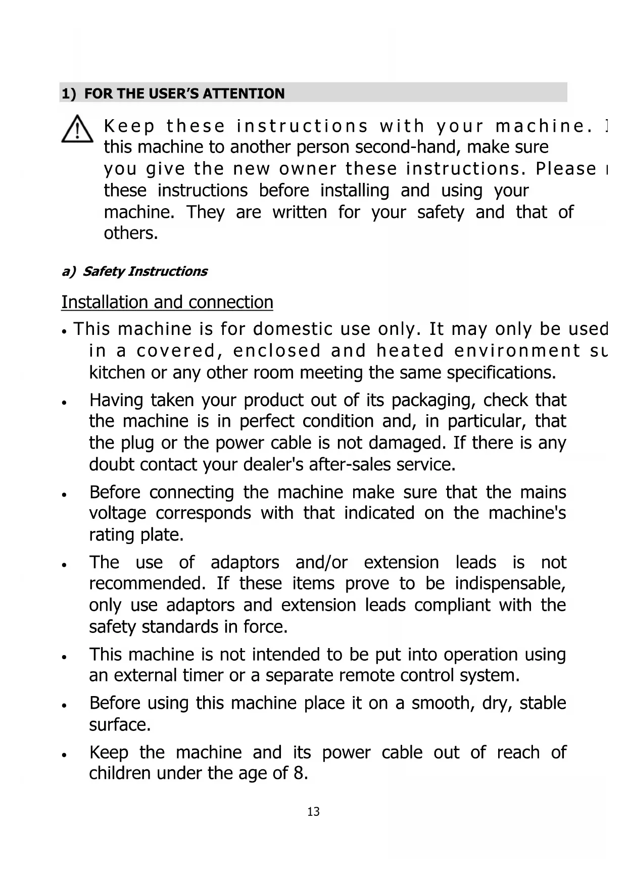 b) Before Using for the First Time Before using this machine for the first time clean the motor unit with a damp cloth. Wash the bowls in hot soapy water. Dry all the parts carefully. Caution, if you use the kitchen machine without the blender, check that the cover for the blender connection (9) is properly fitted on the kitchen machine (See Figure 1- Using the Blender section). Otherwise the kitchen machine will not operate: a safety system will prevent it.17