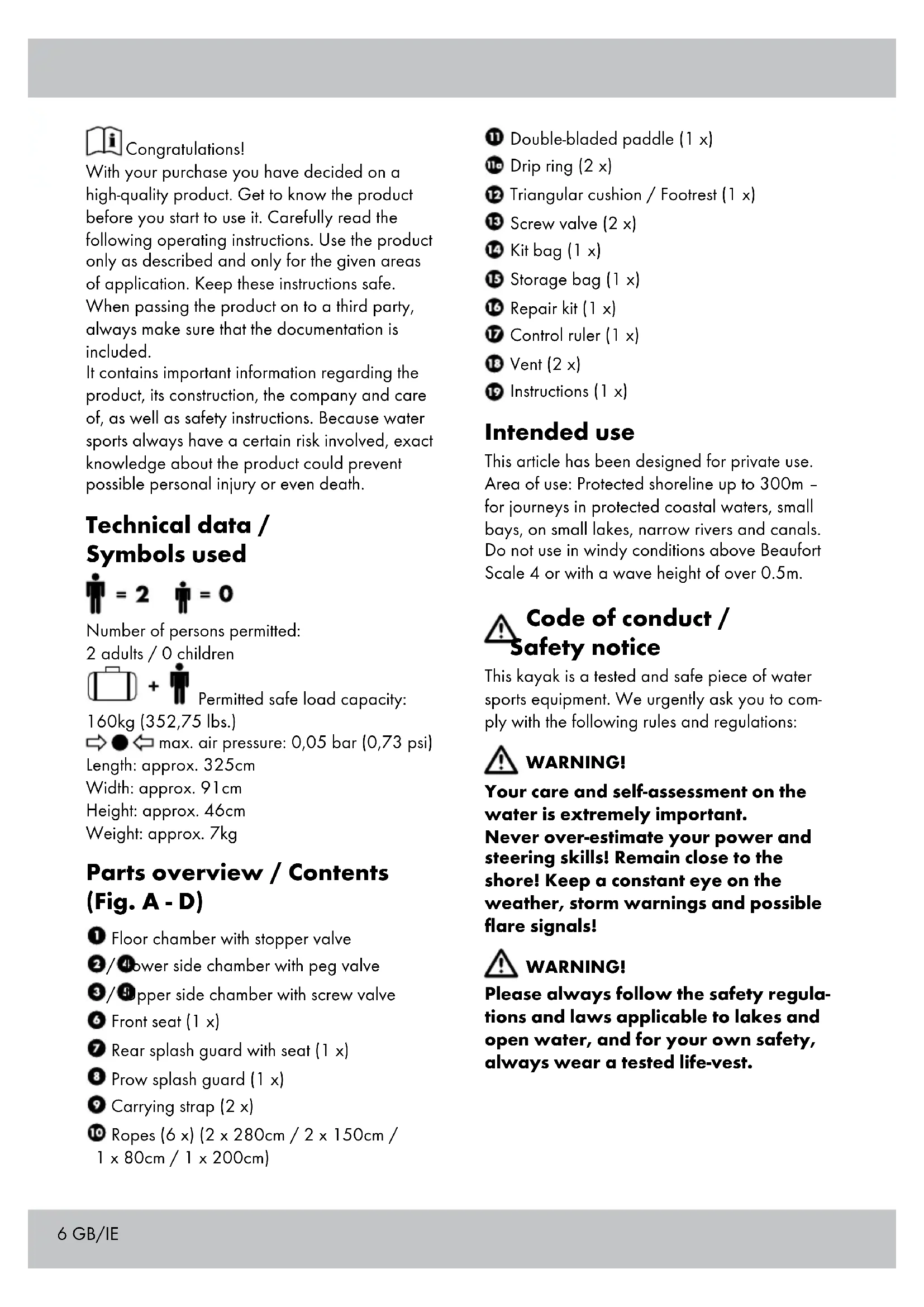 - 3-year warranty Contents Conforms with ISO 6185-1, Category III, Type B6 GB/IE Congratulations! With your purchase you have decided on a high-quality product. Get to know the product before you start to use it. Carefully read the following operating instructions. Use the product only as described and only for the given areas of application. Keep these instructions safe. When passing the product on to a third party, always make sure that the documentation is included. It contains important information regarding the product, its construction, the company and care of, as well as safety instructions. Because water sports always have a certain risk involved, exact knowledge about the product could prevent possible personal injury or even death. Technical data / Symbols used Number of persons permitted: 2 adults / 0 children Permitted safe load capacity: 160kg (352,75 lbs.) max. air pressure: 0,05 bar (0,73 psi) Length: approx. 325cm Width: approx. 91cm Height: approx. 46cm Weight: approx. 7kg Parts overview / Contents (Fig. A - D) Floor chamber with stopper valve / Lower side chamber with peg valve / Upper side chamber with screw valve Front seat (1 x) Rear splash guard with seat (1 x) Prow splash guard (1 x) Carrying strap (2 x) Ropes (6 x) (2 x 280cm / 2 x 150cm / 1 x 80cm / 1 x 200cm) Double-bladed paddle (1 x) Drip ring (2 x) Triangular cushion / Footrest (1 x) Screw valve (2 x) Kit bag (1 x) Storage bag (1 x) Repair kit (1 x) Control ruler (1 x) Vent (2 x) Instructions (1 x) Intended use This article has been designed for private use. Area of use: Protected shoreline up to 300m – for journeys in protected coastal waters, small bays, on small lakes, narrow rivers and canals. Do not use in windy conditions above Beaufort Scale 4 or with a wave height of over 0.5m. Code of conduct / Safety notice This kayak is a tested and safe piece of water sports equipment. We urgently ask you to com- ply with the following rules and regulations: WARNING! Your care and self-assessment on the water is extremely important. Never over-estimate your power and steering skills! Remain close to the shore! Keep a constant eye on the weather, storm warnings and possible flare signals! WARNING! Please always follow the safety regula- tions and laws applicable to lakes and open water, and for your own safety, always wear a tested life-vest.7GB/IE WARNING! Danger of suffocation for children! Never allow children to play unsuper- vised with the packaging materials, or the article itself. WARNING! If a person happens to have fallen over- board, their rescue must take place via the front or rear of the craft. Re-entry at the side can cause the craft to capsize. Danger of injury! Caution by offshore winds! Caution by offshore currents! p. 11