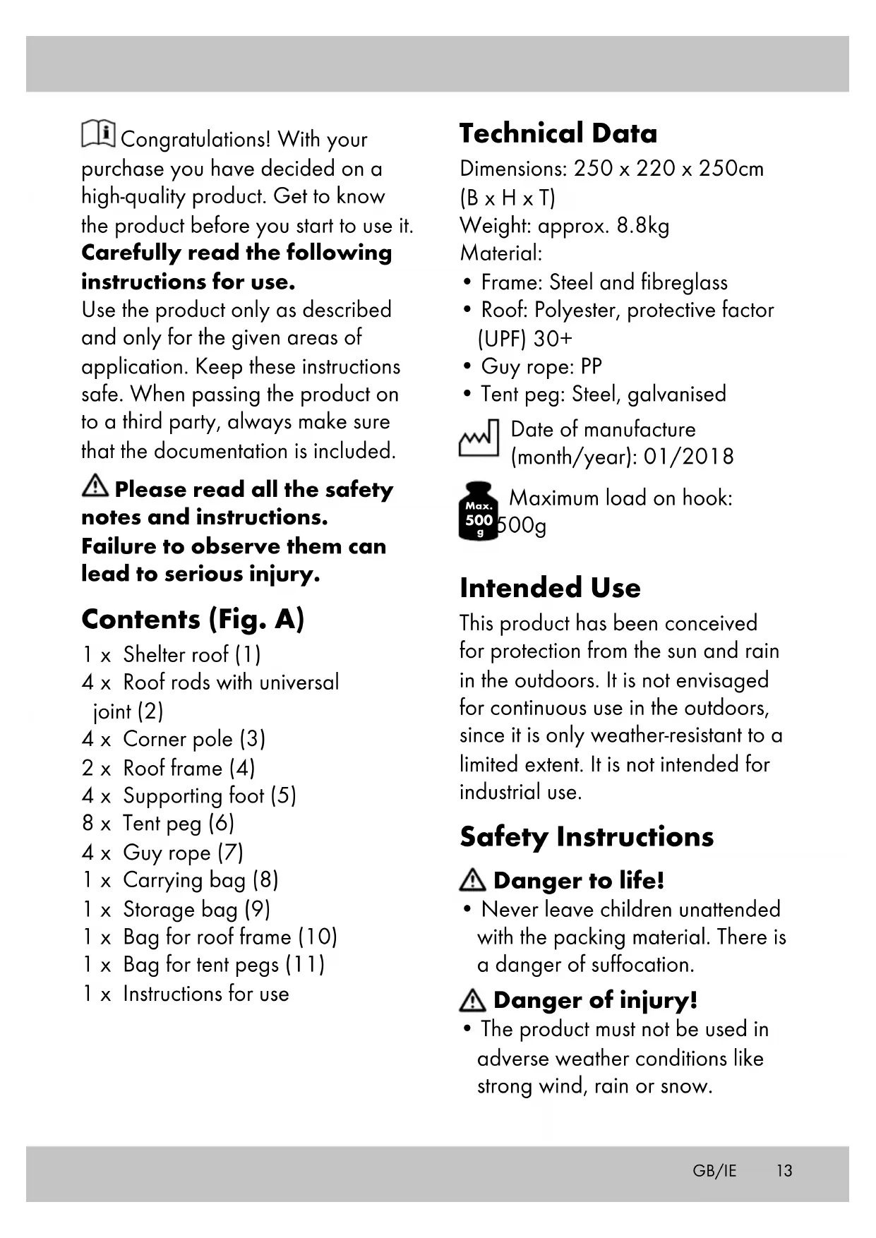 - The ground must be even and give the tent pegs enough grip. Construction Step 1 Remove the product from the various individual bags. Step 2 Unfold the four roof rods with uni- versal joints (2). Fit the colour-coded ends of the rods into the colour- coded openings of the universal joints. Ensure that the locking buttons (2a) fit into the holes both visibly and with an audible click (Fig. B). Caution! Danger of getting stuck. GB/IE15GB/IE Step 7 Thread a tent peg (6) through the loop (1e). Anchor every supporting foot with the help of the tent pegs. To that end, use the openings in the supporting feet (Fig. G). Attention! Check for firm fitting of the tent pegs. Step 8 Knot one guy rope (7) each with every loop (1f) at the outermost corners of the shelter. Stretch out the ropes and fasten each of the ends to a tent peg. The length of the guy ro- pes can be adjusted with a tightener (7a) Fig. G). Attention! Here, too, pay attention to firm fitting of the guy ropes. Dismantling Step 1 Loosen the tent pegs of the guy ropes and supporting feet. Step 2 Loosen the hook-and-loop fasteners at the roof frame. Remove the two rods from the metal pins. Step 3 Unhook the shelter roof at the supporting feet. Fold up the lower segment of the corner poles and remove the shelter roof. Step 3 Push the four corner poles (3) into the universal joints. Ensure that the locking buttons (3a) fit into the holes both visibly and with an audible click. Caution! Danger of getting stuck. Unfold the upper segments of the corner poles (Fig. C). Step 4 Put the shelter roof (1) over the frame. Fasten the shelter roof with the help of the pre-fitted hook-and- loop fasteners (1a) to the corner poles (Fig. D). Step 5 Unfold the lower segments of the corner poles. Fit one supporting foot (5) each into them. Fasten the pre-fitted eyelets (1b) into the hooks (5a) provided for the purpose on the supporting feet (Fig. E). Step 6 Fit the segments of the roof frame (4) together. Push the rods in succession diagonally onto the metal pins (2b) of the universal joint. Fasten the shelter roof by means of the pre-fitted hook-and-loop faste- ners (1c) to the rods. Fix both the rods with the hook-and-loop fastener (1d) (Fig. F).16 Step 4 Press the locking buttons to loosen the corner poles from the universal joints. Fold up the corner poles. Caution! Danger of getting stuck. Step 5 Press the locking buttons at the roof frame and dismantle the rods with corner joints. Fold up the rods. Caution! Danger of getting stuck. Step 6 Pack the product after drying and cleaning back into the storage pouches. Cleaning and Care Care instructions Clean the article with a damp cloth and a mild cleaning agent. Do not use petrol, solvents or harsh cleaners. The roof of the shelter can be treated with impregnation spray. Storage To be able to enjoy this article for a long time we recommend always storing the clean and dry pavilion in a tempered location. Disposal Dispose of the article and the packa- ging materials in accordance with current local regulations. Packaging materials such as foil bags are not suitable to be given to children. Keep the packaging materials out of the reach of children. Notes on the guarantee and service handling The product was produced with great care and under constant supervision. You receive a three-year warranty for this product from the date of purchase. Please retain your receipt. The warranty applies only to mate- rial and workmanship and does not apply to misuse or improper hand- ling. Your statutory rights, especially the warranty rights, are not affected by this warranty. With regard to complaints, please contact the following service hotline or contact us by e-mail. Our service employees will advise as to the subsequent procedure as quickly as possible. We will be personally available to discuss the situation with you. GB/IE17GB/IE Any repairs under the warranty, statutory guarantees or through goodwill do not extend the warranty period. This also applies to replaced and repaired parts. Repairs after the warranty are subject to a charge. IAN: 290255 Service Great Britain Tel.: 0871 5000 720 (£ 0.10/Min.) E-Mail: deltasport@lidl.co.uk Service Ireland Tel.: 1890 930 034 (0,08 EUR/Min., (peak)) (0,06 EUR/Min., (off peak)) E-Mail: deltasport@lidl.ie18 FR/BE Félicitations ! Vous avez acquis un produit de haute qualité. Apprenez à connaître le produit avant sa première utilisation. Lisez pour cela attentivement la notice d’utilisation su- ivante. N’utilisez le produit que comme dé- crit et pour les zones d’application indiquées. Veuillez conserver cette notice d’utilisation. Transmettez tous les documents en cas de cession du produit à une tierce personne. Veuillez lire toutes les consignes de sécurité et les instructions. Le non-respect de ces consignes et instructions peut entraîner des blessures graves. Étendue de livraison (Ill. A) 1 x auvent (1) 4 x piquet de toit à joint universel (2) 4 x piquet d’angle (3) 2 x piquet de toit (4) 4 x pied (5) 8 x sardine (6) 4 x corde de haubanage (7) 1 x sac de transport (8) 1 x sac de rangement (9) 1 x sac pour les piquets de toit (10) 1 x sac pour les sardines (11) 1 x notice d’utilisation Données techniques Dimensions : 250 x 220 x 250 cm (largeur x hauteur x profondeur) Poids : env. 8,8 kg Matériau :