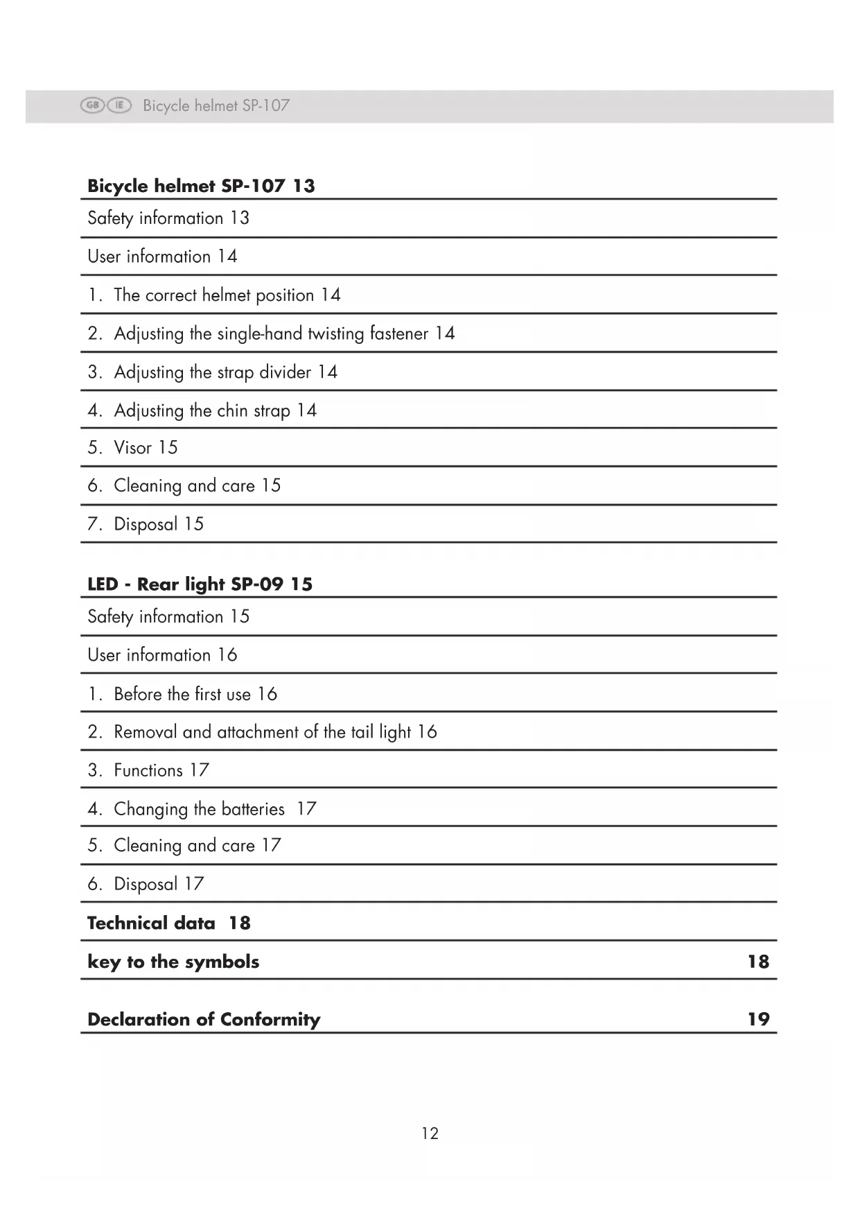 Please do not dispose of at batteries via the household waste, but instead use the collecting container intended for this purpose. Old devices must not be disposed of with household waste! If the product can no longer be used, every user is required by law to dispose of the device separately from household waste, e.g. at a collection point in their community/bo- rough. This ensures that old devices are recycled properly and also avoids pollution of the environment. For this reason, electrical equipment is marked with the symbol shown here. LED-rear light SP-0918 Batteries and rechargeable batteries must not be disposed of as household waste! As a consumer, you are required by law to return all batteries and rechargeable batteries, regardless of whether they contain harmful substances* or not, at a collection point in your local authority / district or in retail to ensure that they can be disposed of in an environmen- tally friendly way. Batteries and rechargeable batteries that are not permanently installed in the device must be removed and disposed of separately before disposal. Please return batteries and rechargeable batteries only when discharged! *marked with: Cd = cadmium, Hg = mercury, Pb = lead Technical data LED rear light Model: SP-09 Battery: 1x CR1620, 3V Protection class: III Risk group: Exempt group (the light does not pose a photobiological hazard) key to the symbols Declaration of conformity (see chapter „Declaration of conformity“): Products marked with this symbol comply with all applicable European Community regulations Economic area. Protection class lll. The LED light is supplied with low voltage via a battery. Expiry date helmet weight Date of manufacture) The Seal of Approved Safety (GS mark) certies that a product meets the requirements of the German Product Safety Act (ProdSG). The GS mark indicates that the safety and health of the user are not at risk if the product is used as intended and if foreseeable misuse of the marked product occurs. LED-rear light SP-0919 Read the user manual DC voltage Declaration of Conformity The EU Declaration of Conformity can be obtained from the following address: SPEQ GmbH Tannbachstraße 10 73635 Steinenberg GERMANY testing institute TÜV Rheinland LGA Products GmbH Tillystrasse 2 90431 Nürnberg Germany identication number: 0197 PSA 2016/425 The complete Declaration of Conformity can be found at www.speq.de/konformitaetserklaerung. LED-rear light SP-0920 Casque de vélo SP-107 21 Consignes de sécurité 21 Conformément aux disposition 22