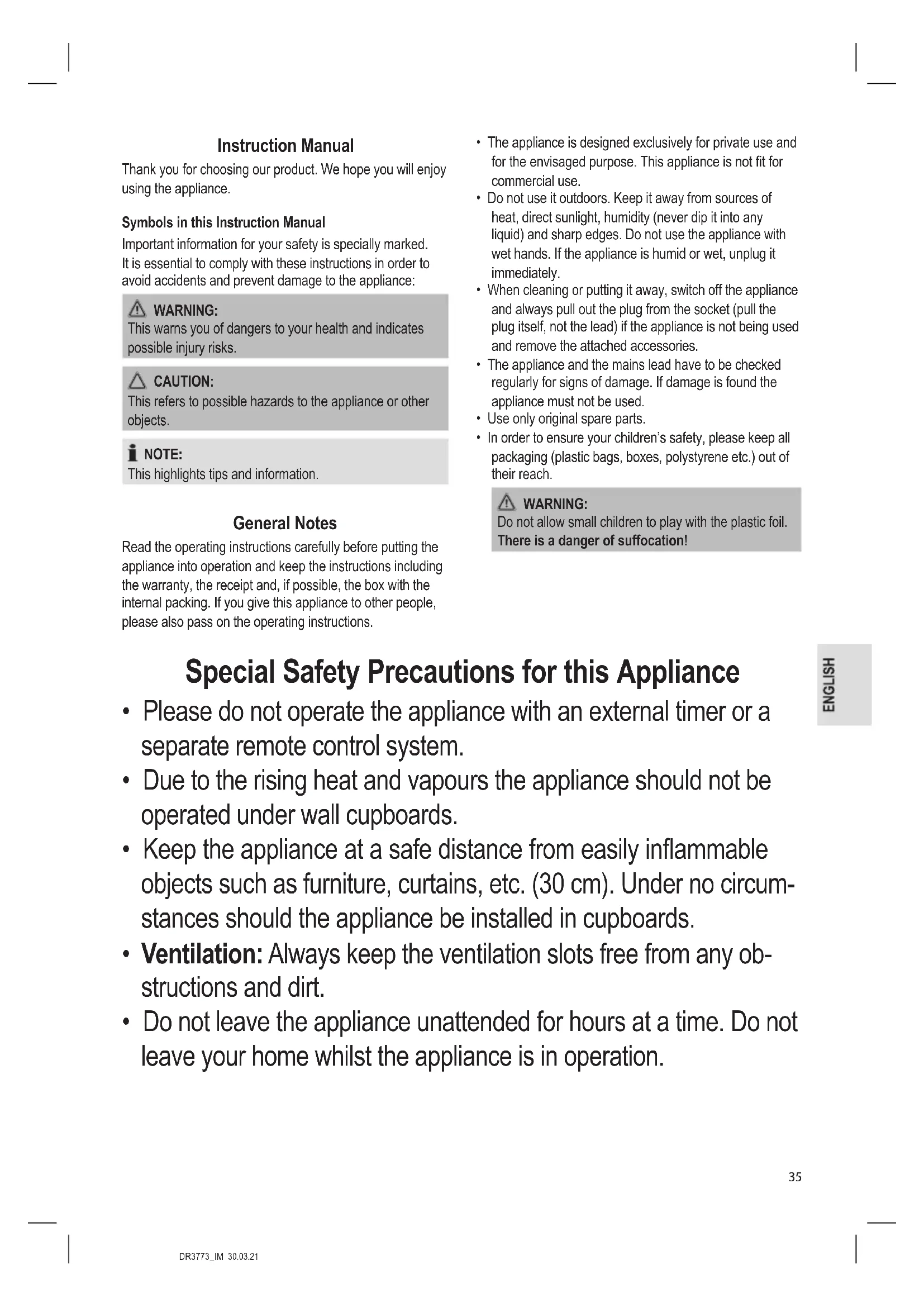 - Do not leave the appliance unattended for hours at a time. Do not leave your home whilst the appliance is in operation.DR3773_IM 30.03.21