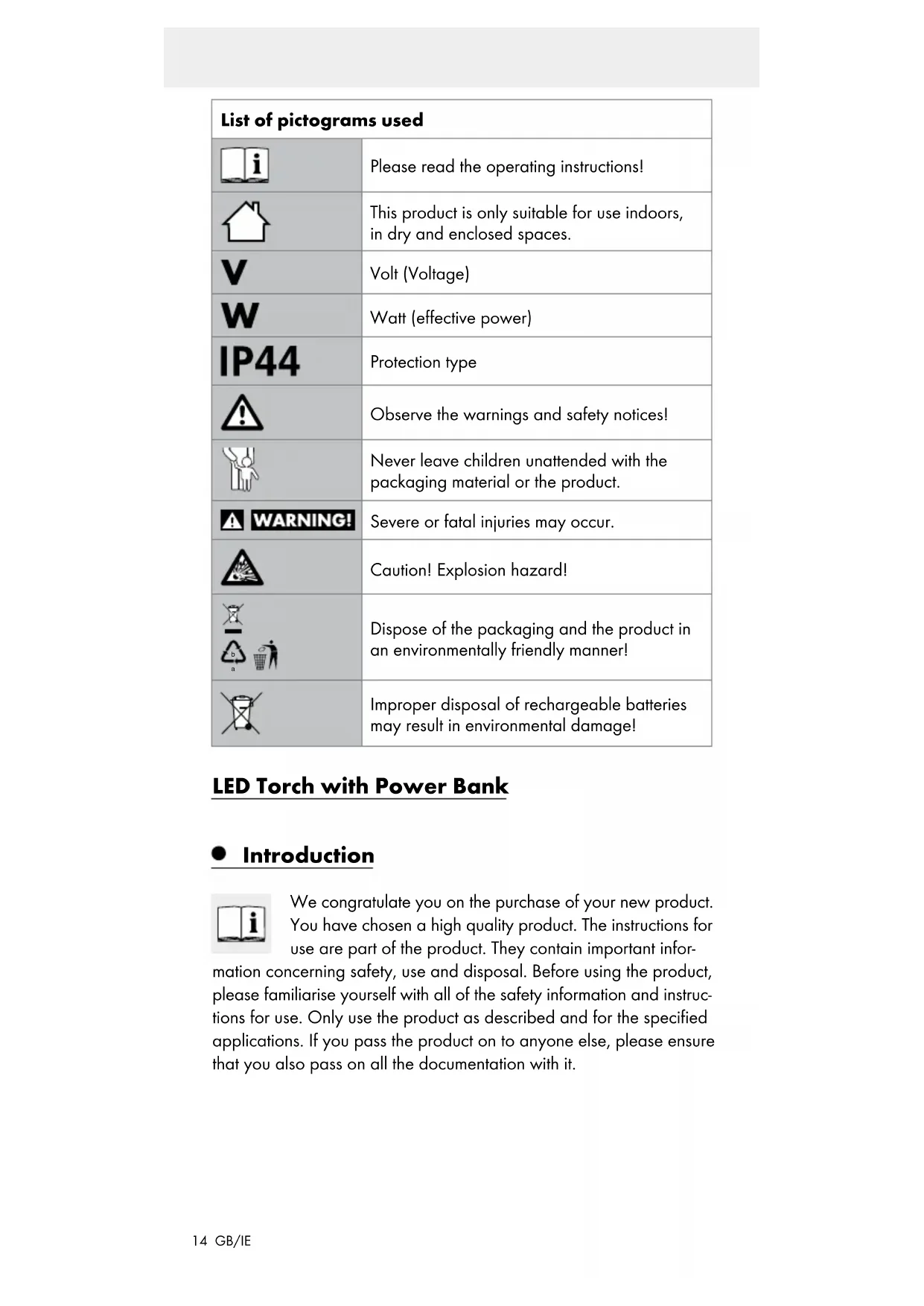 Dispose of the packaging and the product in an environmentally friendly manner! Improper disposal of rechargeable batteries may result in environmental damage! LED Torch with Power Bank Introduction We congratulate you on the purchase of your new product. You have chosen a high quality product. The instructions for use are part of the product. They contain important infor- mation concerning safety, use and disposal. Before using the product, please familiarise yourself with all of the safety information and instruc- tions for use. Only use the product as described and for the specified applications. If you pass the product on to anyone else, please ensure that you also pass on all the documentation with it.15 GB/IE Intended use The LED torch is not intended for use as indoor lighting and is only in- tended for private household use. The car adapter can be used in a normal car socket that provides the rating given under “Technical Data“. Any modifications to the product are considered improper use and may result in considerable hazards. The manufacturer assumes no liability for damages arising from improper use. This product is not intended for commercial use. Scope of delivery 1 LED Torch with Power Bank 1 Lithium-ion rechargeable battery 1 USB Charging Cable 1 Car adapter 1 Instructions for use Parts description