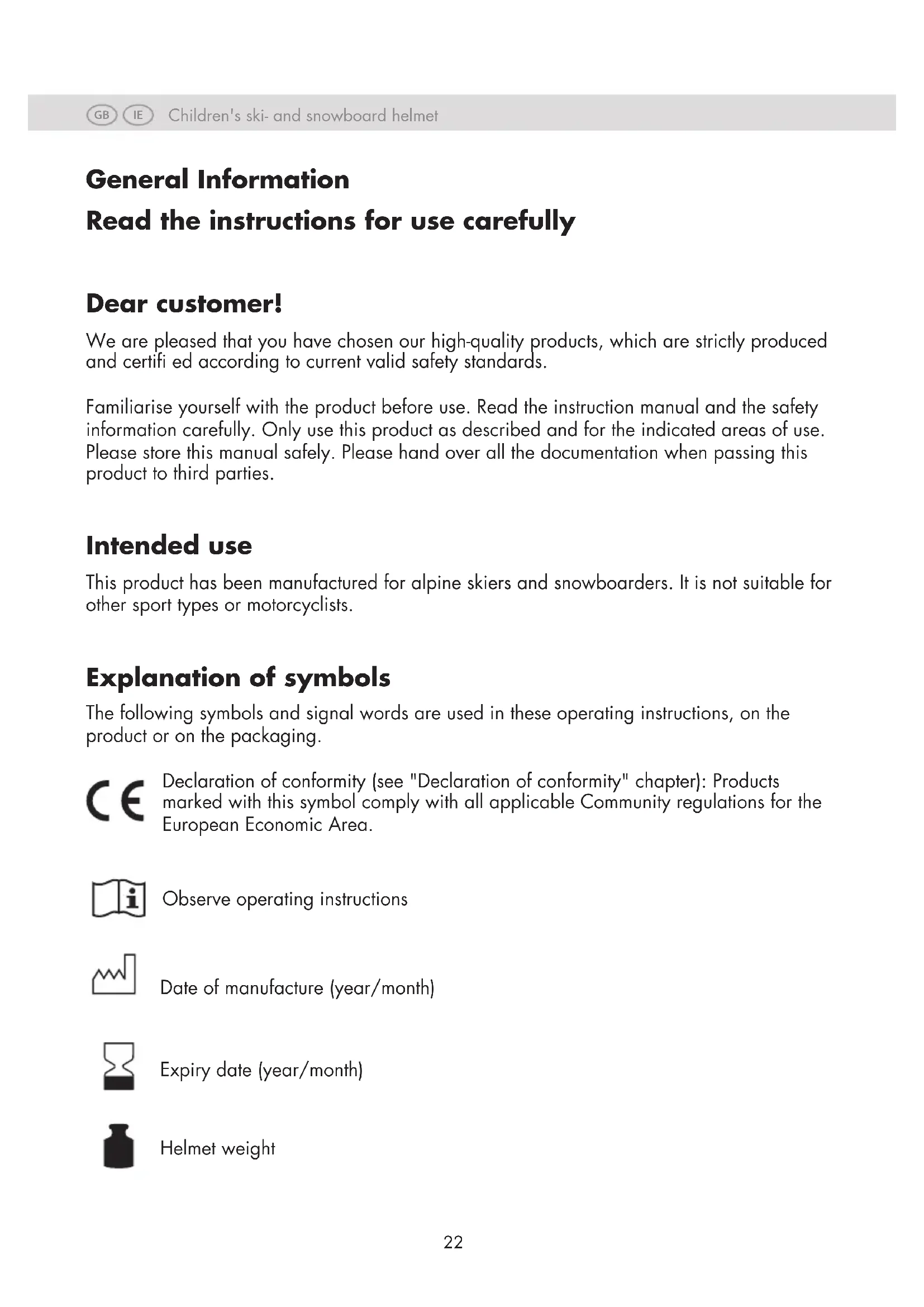 General Information Read the instructions for use carefully Dear customer! We are pleased that you have chosen our high-quality products, which are strictly produced and certi ed according to current valid safety standards. Familiarise yourself with the product before use. Read the instruction manual and the safety information carefully. Only use this product as described and for the indicated areas of use. Please store this manual safely. Please hand over all the documentation when passing this product to third parties. Intended use This product has been manufactured for alpine skiers and snowboarders. It is not suitable for other sport types or motorcyclists. Explanation of symbols The following symbols and signal words are used in these operating instructions, on the product or on the packaging. Declaration of conformity (see "Declaration of conformity" chapter): Products marked with this symbol comply with all applicable Community regulations for the European Economic Area. Observe operating instructions Date of manufacture (year/month) Expiry date (year/month) Helmet weightChildren's ski- and snowboard helmet