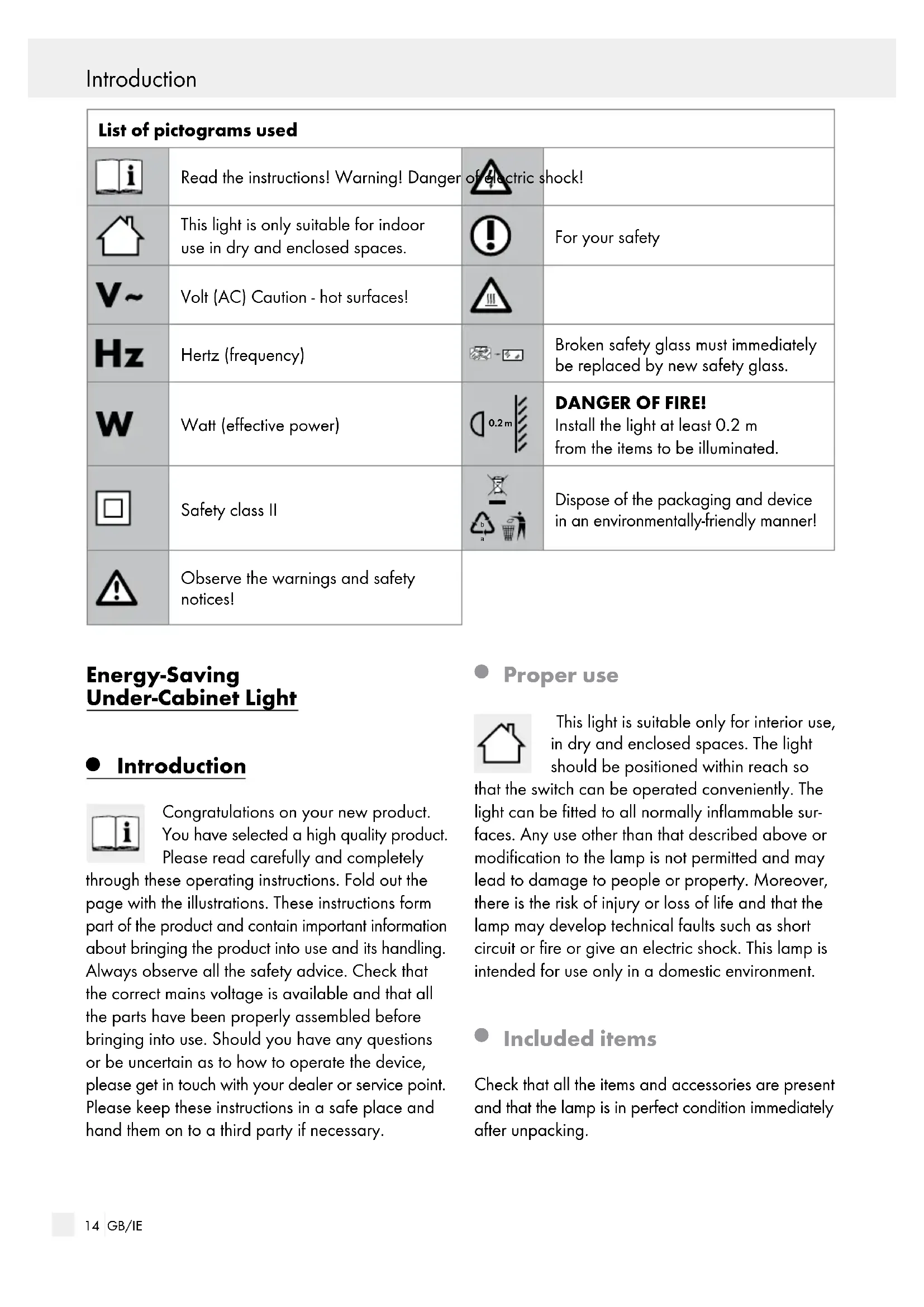 Safety Safety advice The right to claim under the guarantee shall be ren- dered invalid in respect of damage caused by the non-observance of these operating instructions. No liability is accepted for consequent damage. No liability is accepted for damage to property or persons caused by improper handling or non- observance of the safety advice. To avoid danger to life from electric shock Before connecting it to the mains, always check the light, the power cable as well as the con- necting cable if need be for any damage. Never use the light if you see any damage. Damaged power cables and connecting ca- bles are a danger to life as you could suffer an electric shock. Before assembly, ensure that the mains voltage available corresponds to the operating voltage necessary of the light (see „Technical Data“). Never let the lamp come into contact with water or other liquids. Never open or insert anything into electrical fittings or equipment. Doing this sort of thing can lead to a serious danger to life from electric shock. Touch only the insulated part of the plug when connecting to or disconnecting from the mains supply. If the external flexible cable of this lamp is damaged, it may only be replaced by a special cable or a cable that is only available from the manufacturer or his service representative. Only connect the under-cabinet light to the mains current using the original power cable. Only connect original under-cabinet lights of the same type (Model 14102104L or 14102106L) with each other. Only use the original connecting cable supplied to do so. Connect the under-cabinet lights that are linked up together to one socket only. Make sure that you only connect a maximum of 10 linked-up under-cabinet lights of the same type to one socket. Otherwise this might overload the con- nections and cables. Introduction Introduction / Safety16 GB/IE Make sure that all under-cabinet lights are linked up via connecting cables before inserting the power cable into the socket. To avoid danger of fire and injury RISK OF INJURY! Check every bulb and lampshade for damage immediately upon unpacking. Do not operate the light with a defective bulb or glass cover. If they are, contact the service point for a re- placement. RISK OF INJURY FROM BURNS! Ensure the lamp has been switched off and al- lowed to cool before you touch it. In this way you will avoid the danger of burns. Light bulbs develop a great deal of heat. Do not touch bulb components or bulbs as they can reach temperatures > 60 °C during operation. Allow the light to cool down completely before replacing a defective bulb. Replace defective bulbs immediately. Before replacing the bulb always remove the mains plug from the socket.