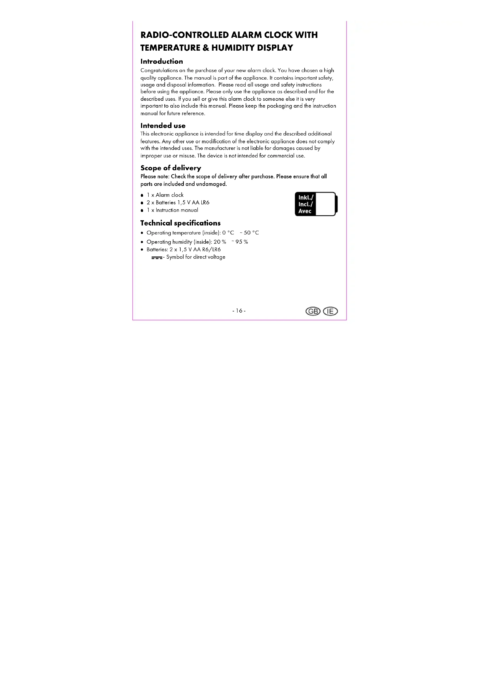 Introduction Congratulations on the purchase of your new alarm clock. You have chosen a high quality appliance. The manual is part of the appliance. It contains important safety, usage and disposal information. Please read all usage and safety instructions before using the appliance. Please only use the appliance as described and for the described uses. If you sell or give this alarm clock to someone else it is very important to also include this manual. Please keep the packaging and the instruction manual for future reference. Intended use This electronic appliance is intended for time display and the described additional features. Any other use or modification of the electronic appliance does not comply with the intended uses. The manufacturer is not liable for damages caused by improper use or misuse. The device is not intended for commercial use. Scope of delivery Please note: Check the scope of delivery after purchase. Please ensure that all parts are included and undamaged.