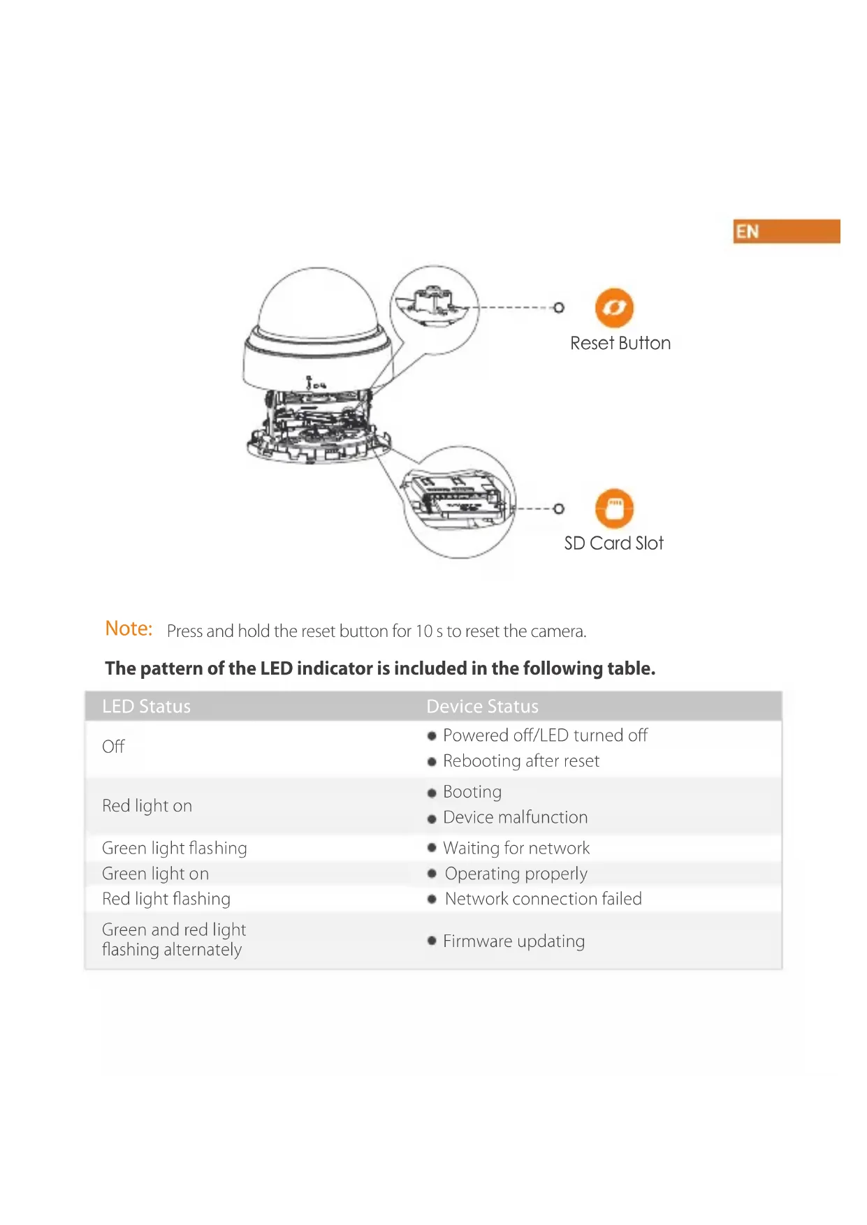 Booting Device malfunction Red light on Green and red light flashing alternately Device Status Waiting for network Green light on Operating properly Green light flashing Red light flashing Network connection failed Firmware updating Powered o/LED turned o Rebooting after reset Reset Button SD Card Slot Press and hold the reset button for 10 s to reset the camera.1 Tips