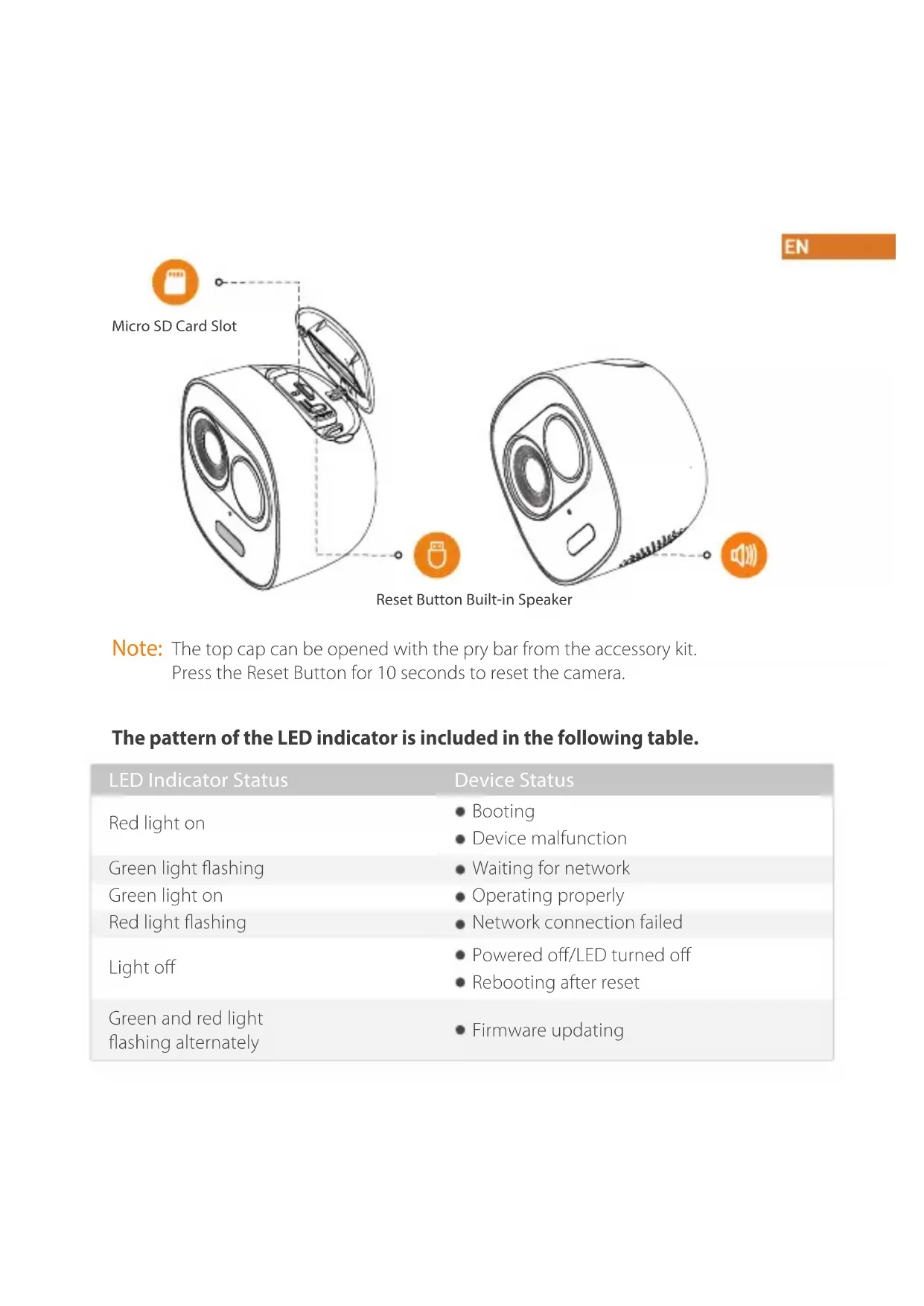 Quick Start Guide www.imoulife.com LOOCWelcome Thank you for choosing IMOU. We are devoted to providing you easy smart home products. If you have problems using the product, please contact our service team before returning your product. Our service mail: service.global@imoulife.com Frequently asked questions can be found at imoulife.com/support/helpPackage content Camera introduction Bracket ×1 Ins tallation Position Map ×1 Device ×1 Quick Start Guide ×1 Screw Package ×1 Cable Clip Package ×1 Power Adapter ×1 Pry Bar ×1 PIR Detector Microphone Lens Spotlight LED IndicatorNote: The pattern of the LED indicator is included in the following table. LED Indicator Status Device Status Operating properly Network connection failed Booting Device malfunction Micro SD Card SlotReset Button Built-in Speaker The top cap can be opened with the pry bar from the accessory kit. Press the Reset Button for 10 seconds to reset the camera. Red light on Green light flashing Green light on Red light flashing Light off Powered off/LED turned off Rebooting after reset Waiting for network Firmware updating Green and red light flashing alternatelyTips