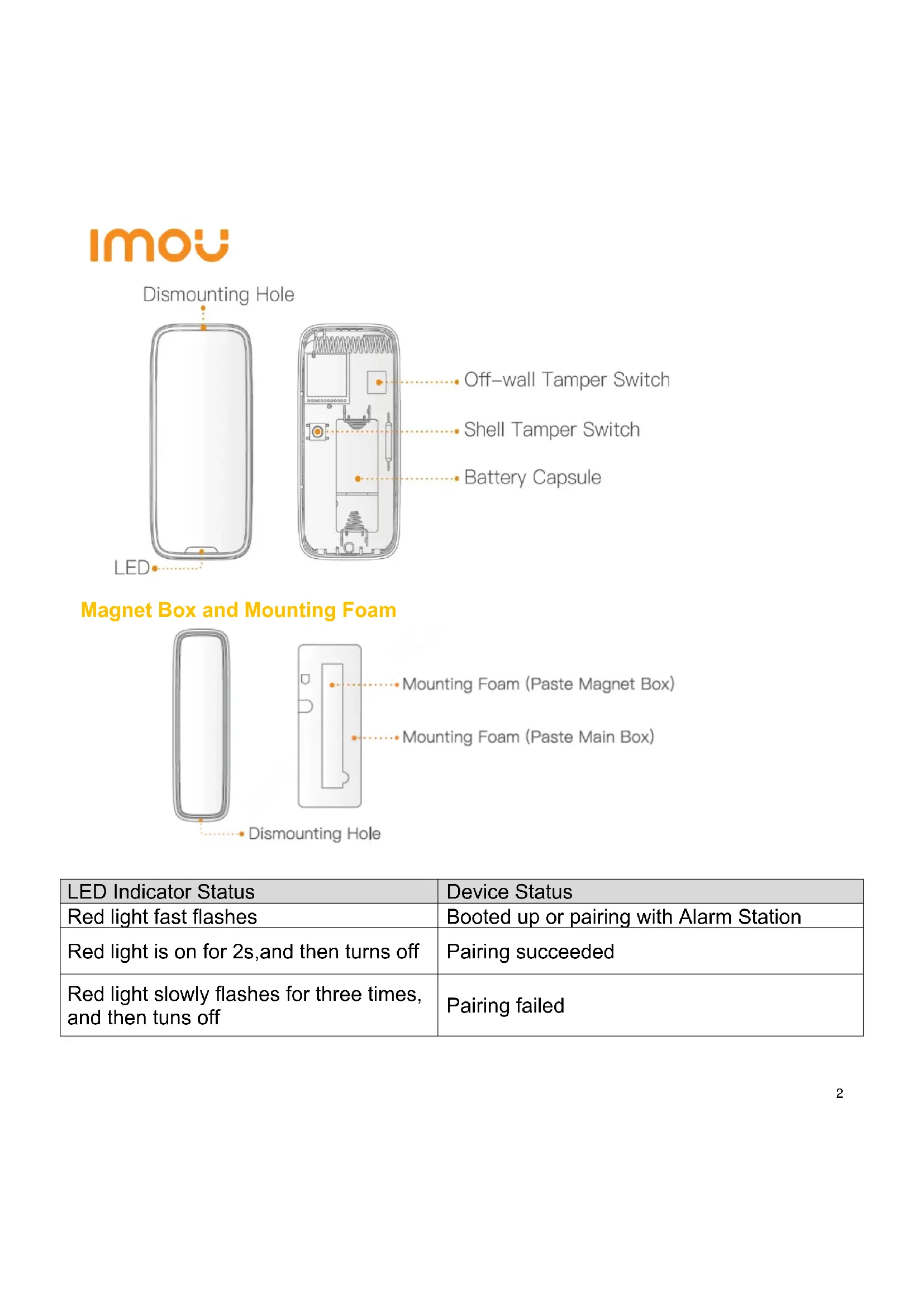 LED Indicator Status Device Status Red light fast flashes Booted up or pairing with Alarm Station Red light is on for 2s,and then turns off Pairing succeeded Red light slowly flashes for three times, and then tuns off Pairing failed3 Start to Use 3 Imou APP If Imou app has added the Alarm Station,add the detector according to app prompts. Note: If the detector has paired with another Alarm Station, you can undo previous pairing by quickly clicking tamper switch for 5 times to clear the existing pairing configuration. Installation 4 Caution: — Stick magnet box tightly to the side pointed by triangular arrow on the rear of main box. — We suggest pasting the main box on door/window frame, and magnet box on door/window. Install main box as follows:
