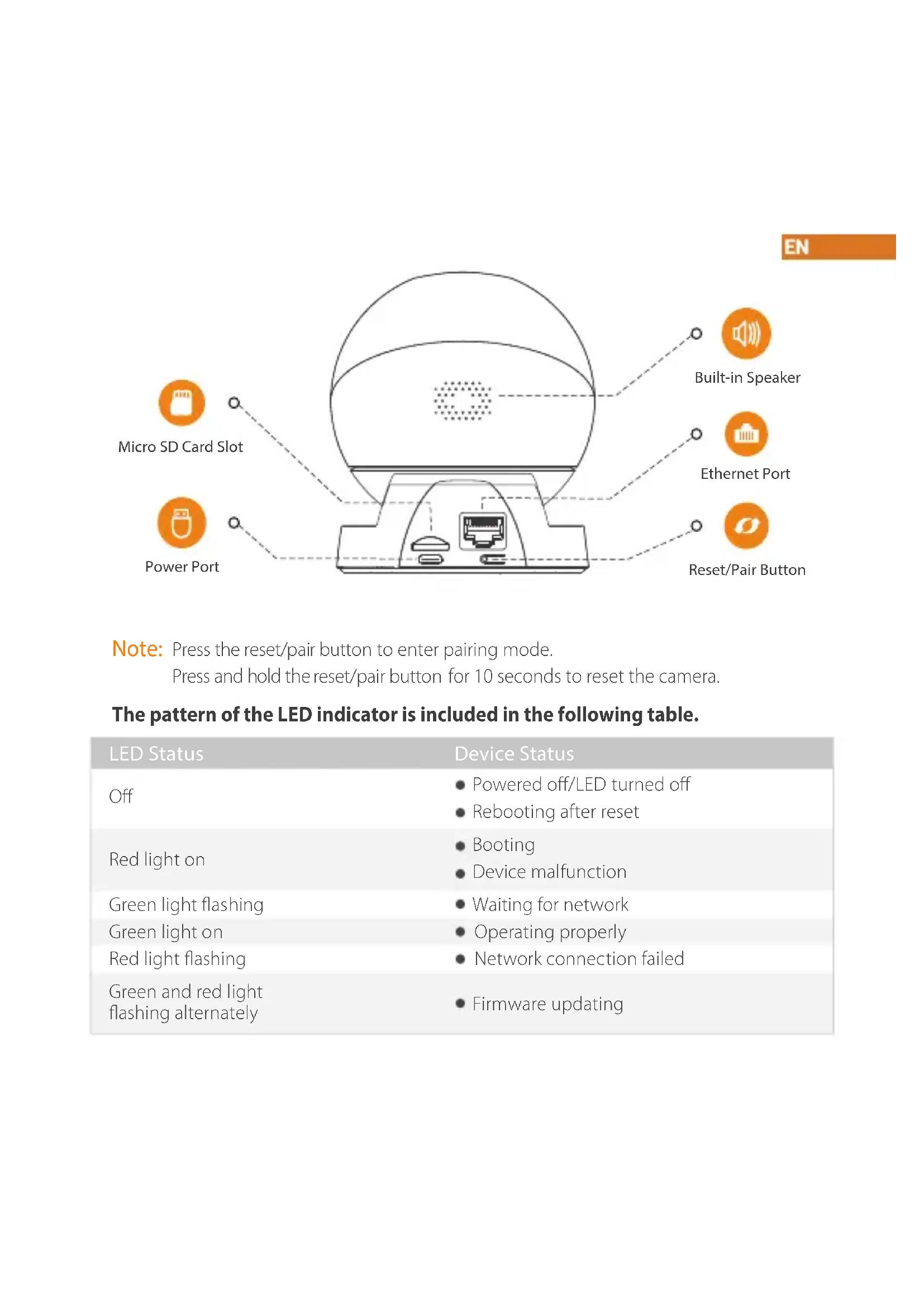 Ranger Pro Quick Start Guide www.imoulife.comWelcome Thank you for choosing IMOU. We are devoted to providing you easy smart home products. If you have problems using the product, please contact our service team before returning your product. Our service mail: service.global@Imoulife.com Frequently asked questions can be found at imoulife.com/support/helpPackage content Camera introduction Quick Start Guide ×1 Screw Package ×1 Camera ×1 Power Cable ×1 Power Adapter ×1 Positioning Map ×1 Mounting Plate ×1 Built-in Mic Lens LED IndicatorBuilt-in SpeakerMicro SD Card SlotPower PortEthernet PortReset/Pair Button Note: Press and hold the reset/pair button for 10 seconds to reset the camera. The pattern of the LED indicator is included in the following table. LED Status