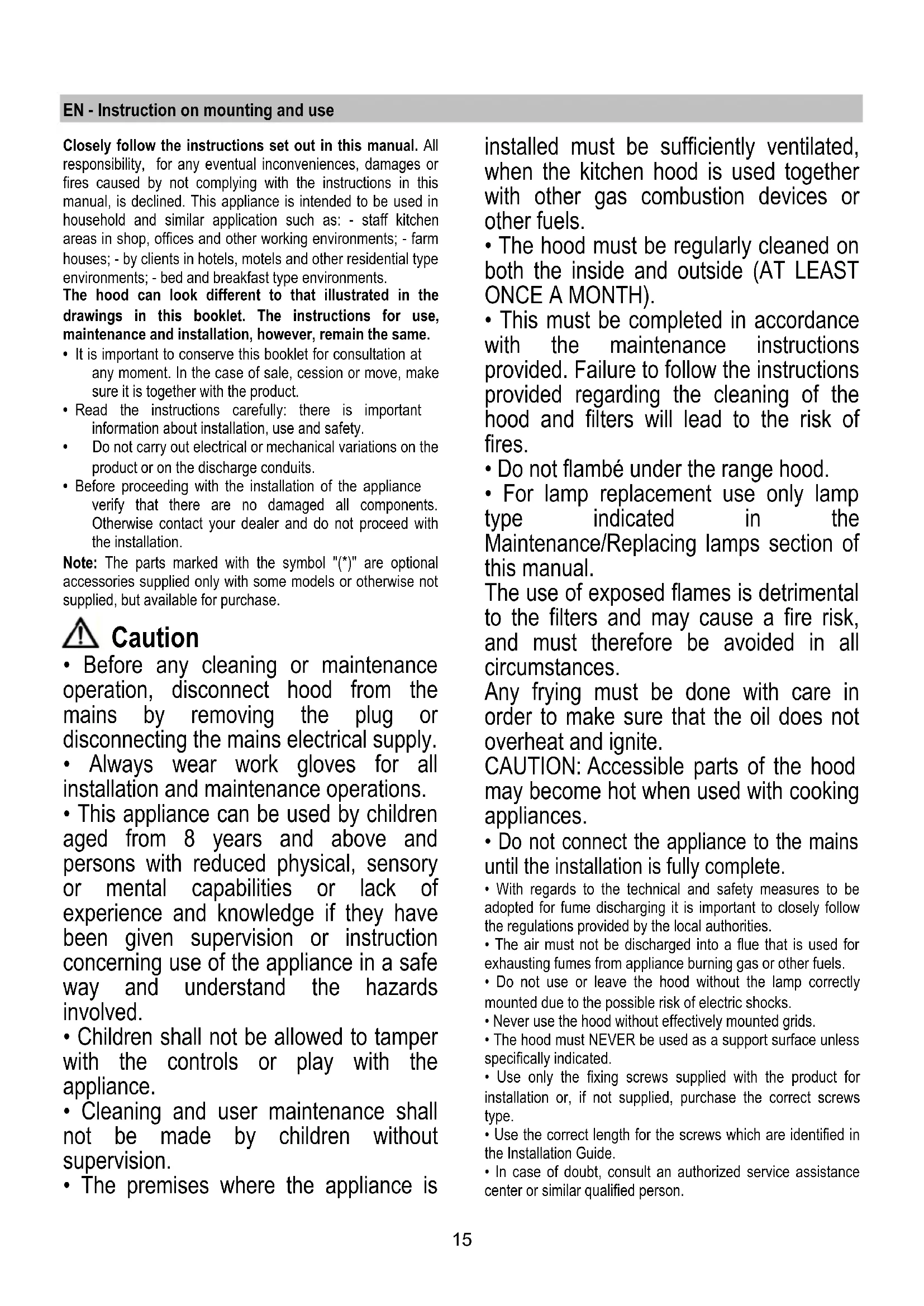 - This must be completed in accordance with the maintenance instructions provided. Failure to follow the instructions provided regarding the cleaning of the hood and filters will lead to the risk of fires.