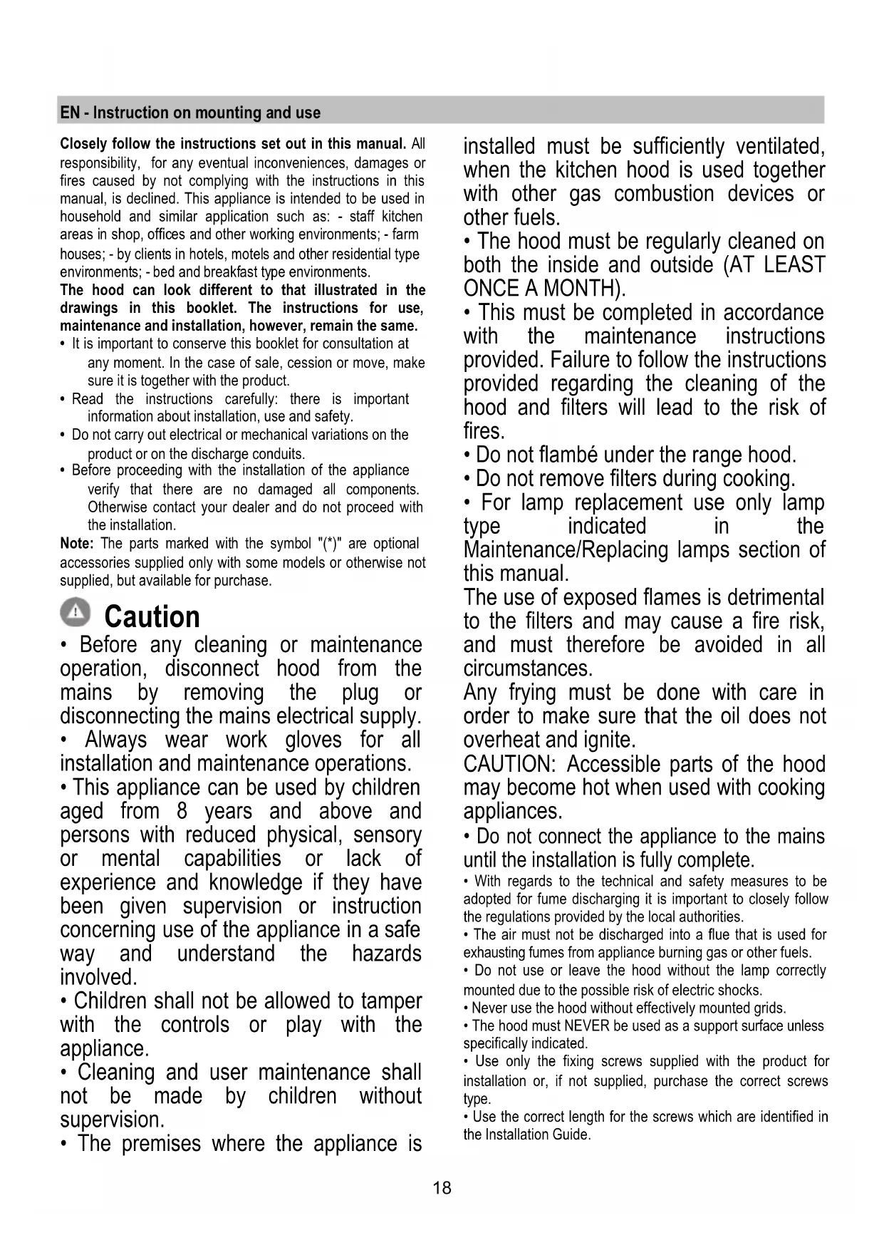 - This must be completed in accordance with the maintenance instructions provided. Failure to follow the instructions provided regarding the cleaning of the hood and filters will lead to the risk of fires.