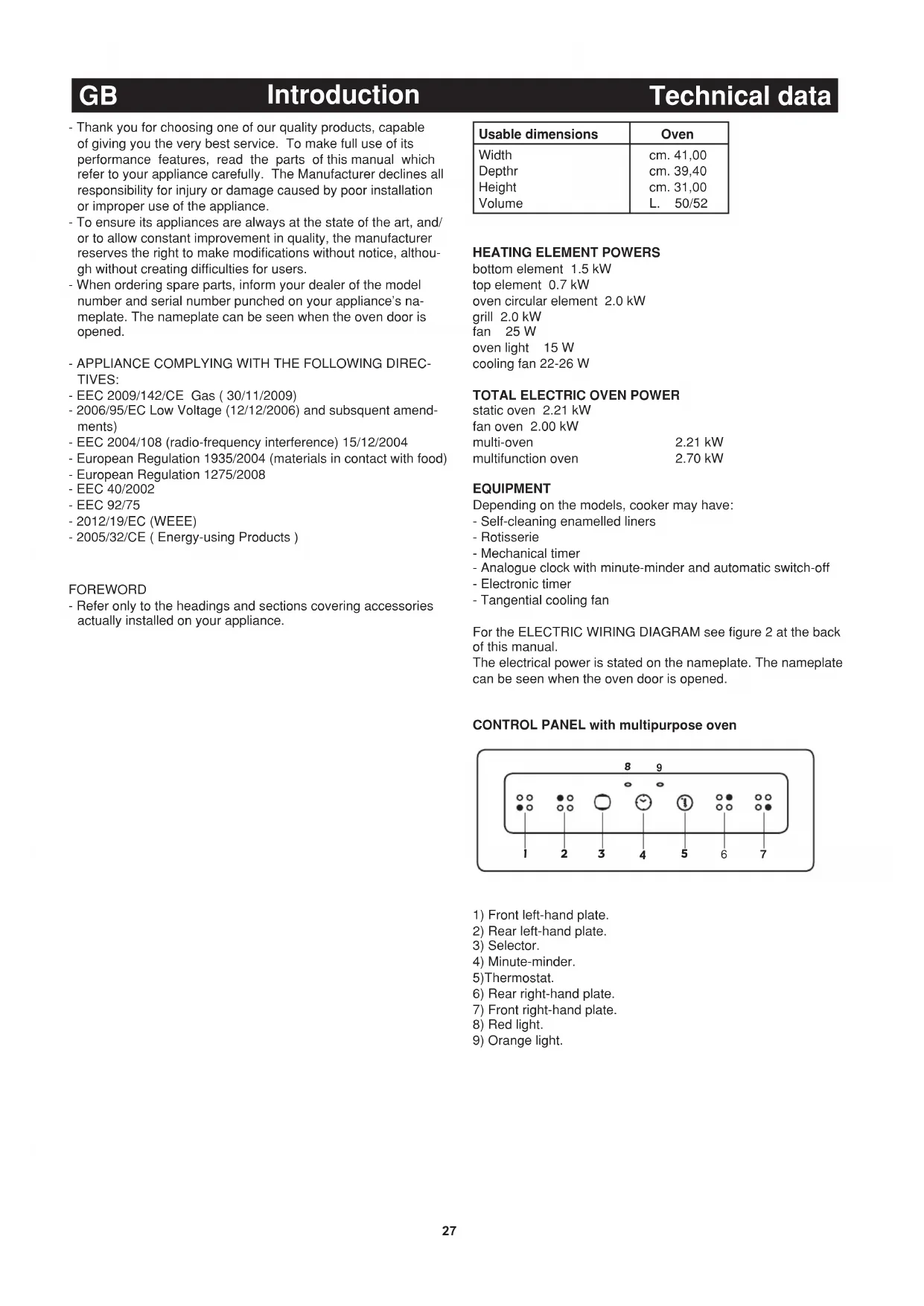 static oven 2.21 kW fan oven 2.00 kW multi-oven 2.21 kW multifunction oven 2.70 kW EQUIPMENT Depending on the models, cooker may have: - Self-cleaning enamelled liners - Rotisserie - Mechanical timer - Analogue clock with minute-minder and automatic switch-off - Electronic timer - Tangential cooling fan For the ELECTRIC WIRING DIAGRAM see figure 2 at the back of this manual. The electrical power is stated on the nameplate. The nameplate can be seen when the oven door is opened. CONTROL PANEL with multipurpose oven
