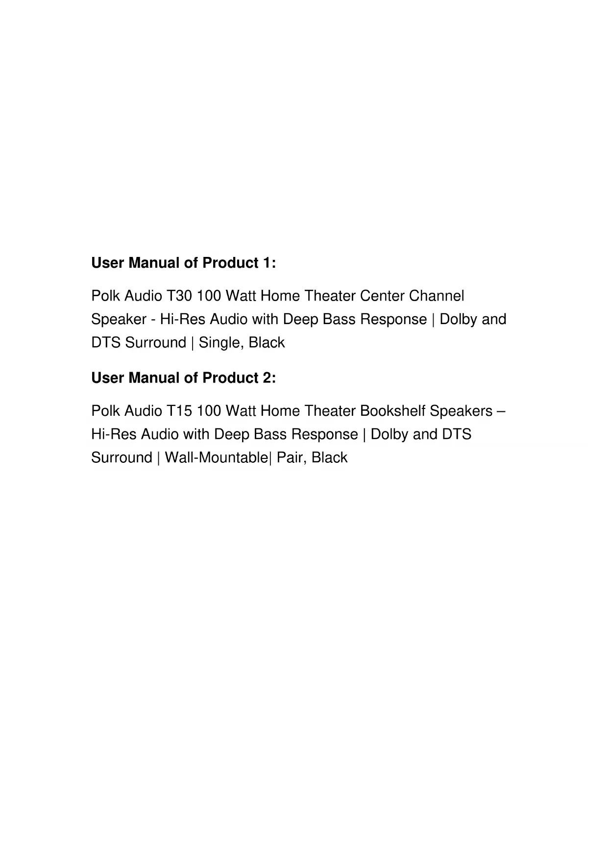 User Manual of Product 1: Polk Audio T30 100 Watt Home Theater Center Channel Speaker - Hi-Res Audio with Deep Bass Response | Dolby and DTS Surround | Single, Black User Manual of Product 2: Polk Audio T15 100 Watt Home Theater Bookshelf Speakers – Hi-Res Audio with Deep Bass Response | Dolby and DTS Surround | Wall-Mountable| Pair, BlackT Series