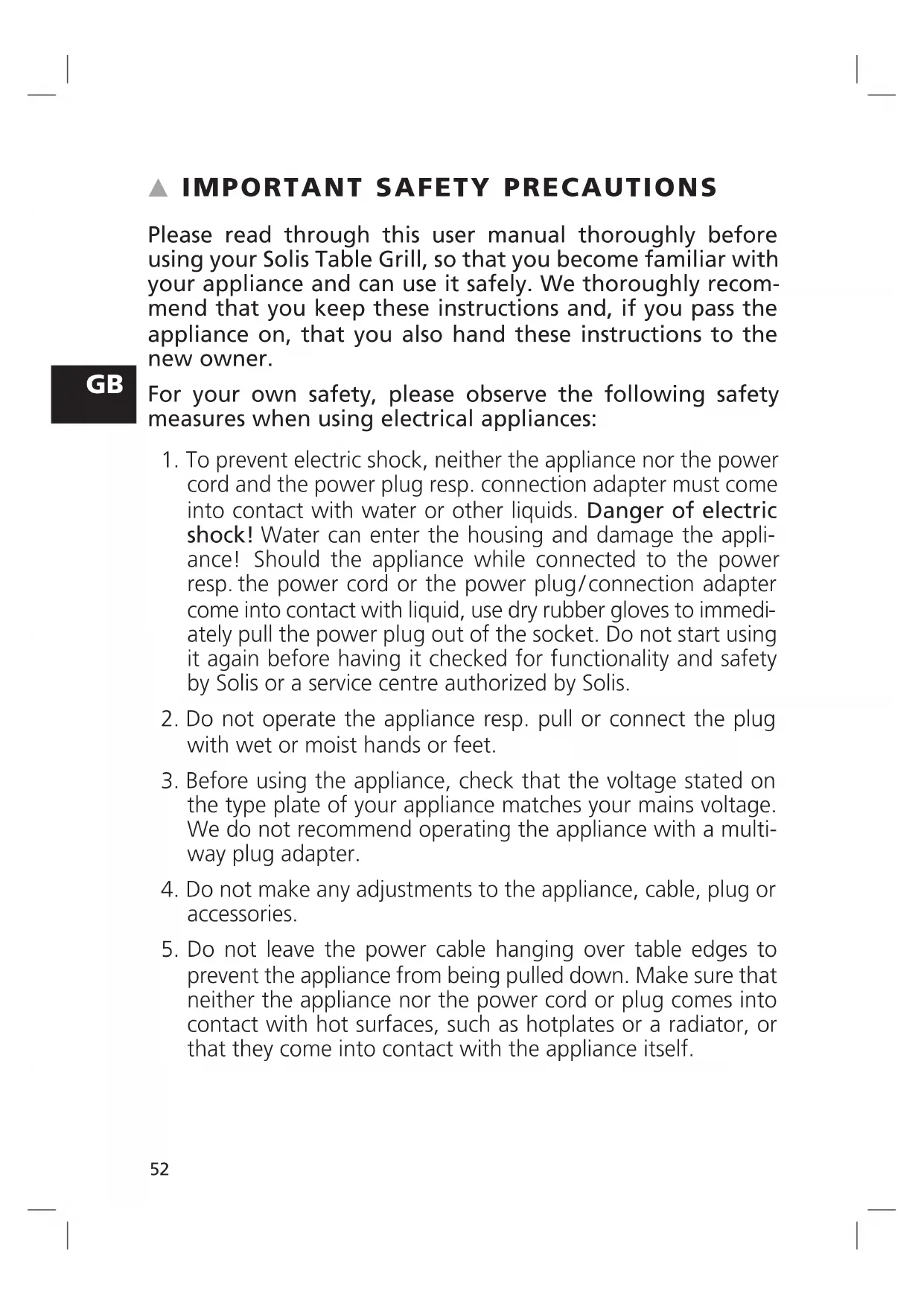 Please read through this user manual thoroughly before using your Solis Table Grill, so that you become familiar with your appliance and can use it safely. We thoroughly recom- mend that you keep these instructions and, if you pass the appliance on, that you also hand these instructions to the new owner. For your own safety, please observe the following safety measures when using elec trical appliances: