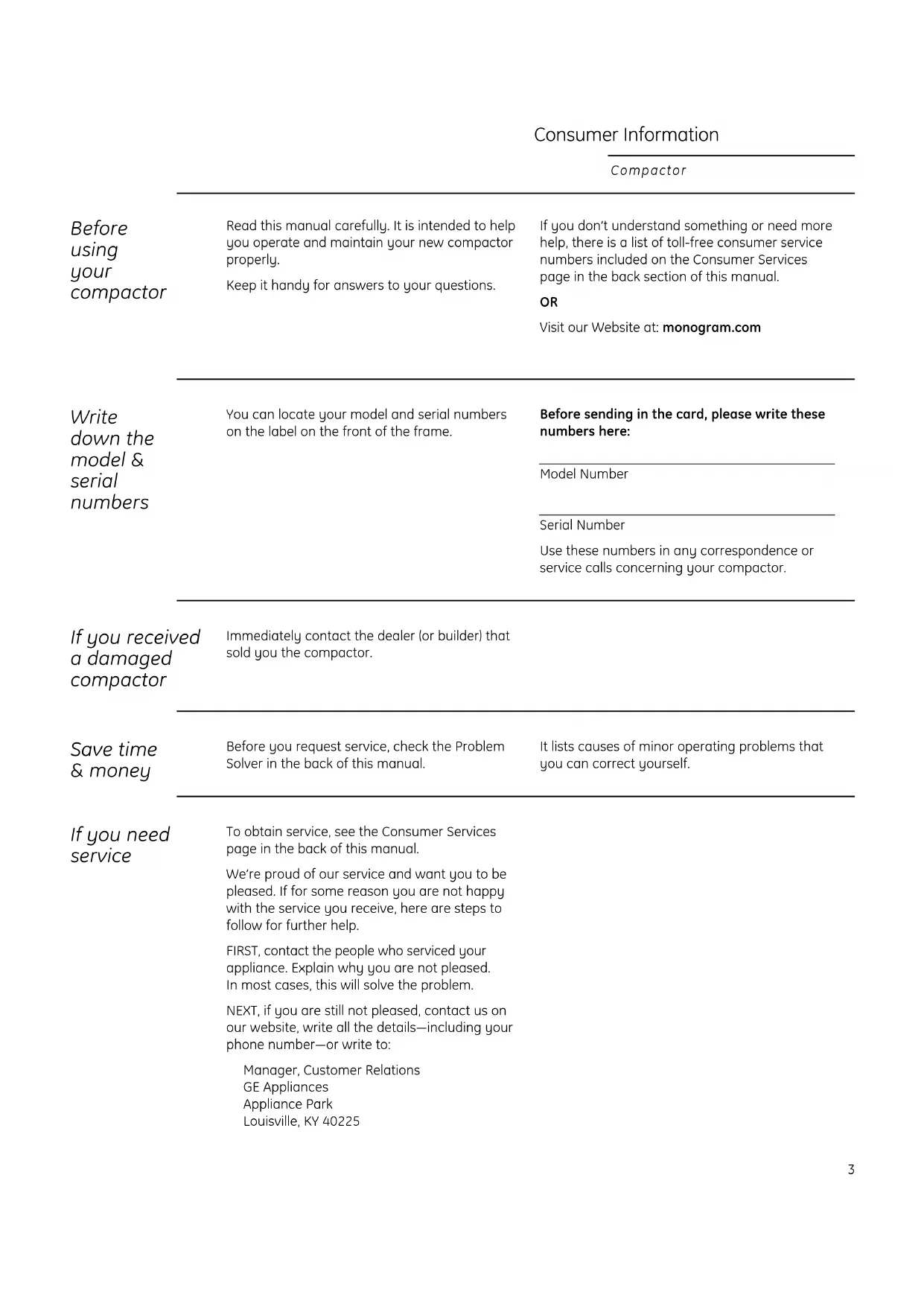 Visit our Website at: monogram.com Write down the model & serial numbers You can locate your model and serial numbers on the label on the front of the frame. Before sending in the card, please write these numbers here: Model Number Serial Number Use these numbers in any correspondence or service calls concerning your compactor. If you received a damaged compactor Immediately contact the dealer (or builder) that sold you the compactor. Save time & money Before you request service, check the Problem Solver in the back of this manual. It lists causes of minor operating problems that you can correct yourself. If you need service To obtain service, see the Consumer Services page in the back of this manual. We’re proud of our service and want you to be pleased. If for some reason you are not happy with the service you receive, here are steps to follow for further help. FIRST, contact the people who serviced your appliance. Explain why you are not pleased. In most cases, this will solve the problem. NEXT, if you are still not pleased, contact us on our website, write all the details—including your phone number—or write to: Manager, Customer Relations GE Appliances Appliance Park Louisville, KY 402254