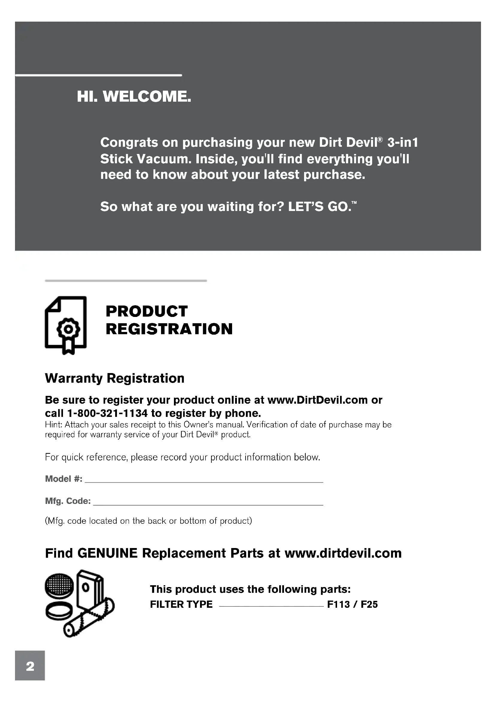 HI. WELCOME. PRODUCT REGISTRATION For quick reference, please record your product information below. Model #: Mfg. Code: (Mfg. code located on the back or bottom of product) Warranty Registration Be sure to register your product online at www.DirtDevil.com or call 1-800-321-1134 to register by phone. Hint: Attach your sales receipt to this Owner’s manual. Verification of date of purchase may be required for warranty service of your Dirt Devil