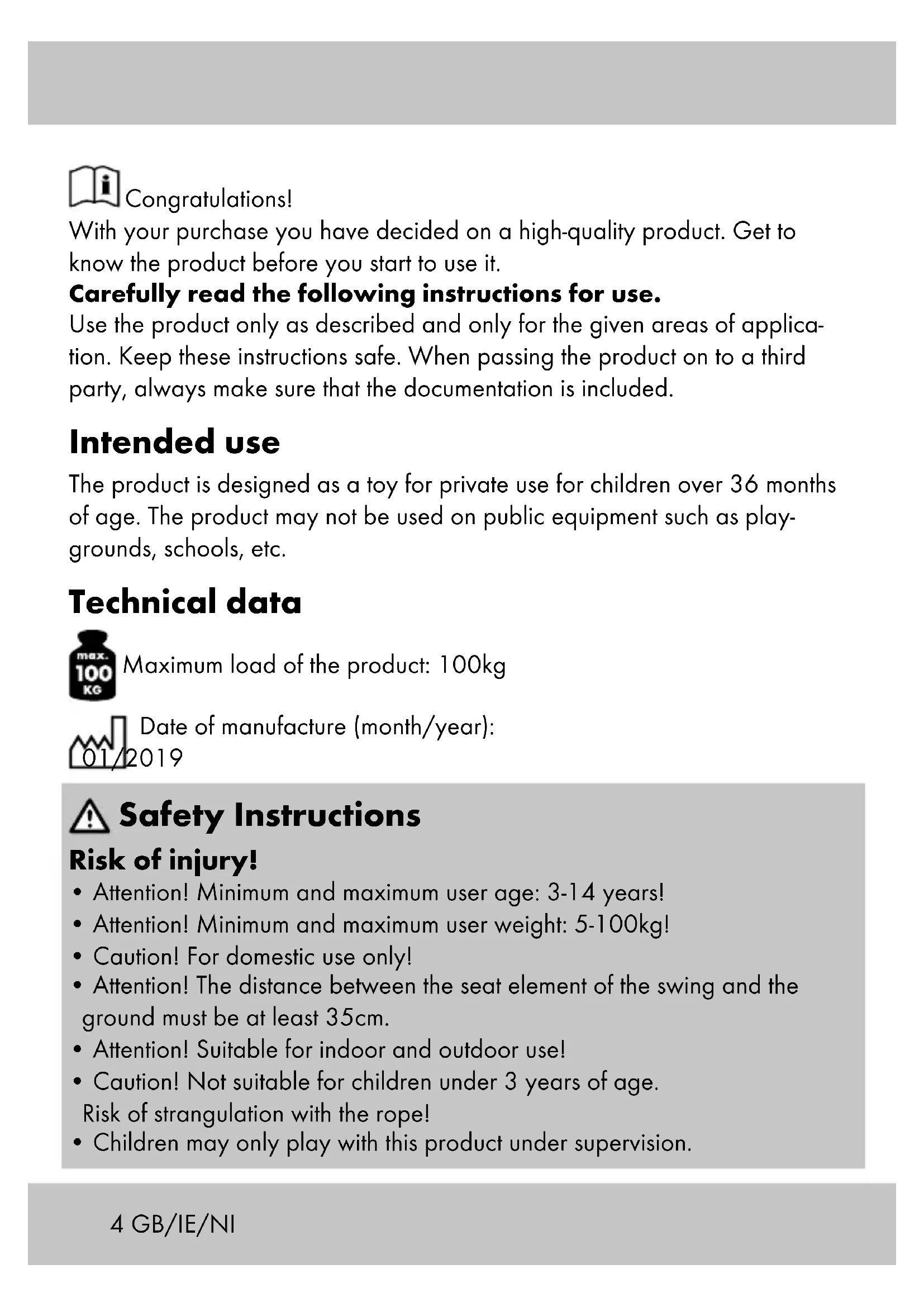 - - 29 Gebrauchsanweisung - 364 GB/IE/NI Congratulations! With your purchase you have decided on a high-quality product. Get to know the product before you start to use it. Carefully read the following instructions for use. Use the product only as described and only for the given areas of applica- tion. Keep these instructions safe. When passing the product on to a third party, always make sure that the documentation is included. Intended use The product is designed as a toy for private use for children over 36 months of age. The product may not be used on public equipment such as play- grounds, schools, etc. Technical data Maximum load of the product: 100kg Date of manufacture (month/year): 01/2019 Safety Instructions Risk of injury! p. 30