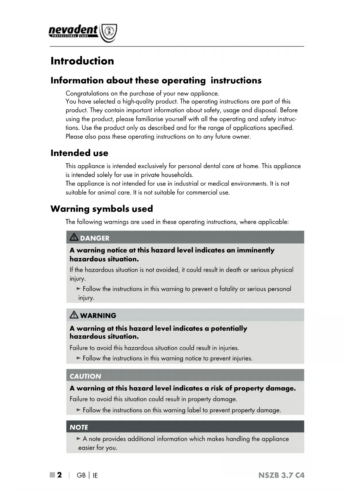 NSZB 3.7 C4 Introduction Information about these operating instructions Congratulations on the purchase of your new appliance. You have selected a high-quality product. The operating instructions are part of this product. They contain important information about safety, usage and disposal. Before using the product, please familiarise yourself with all the operating and safety instruc- tions. Use the product only as described and for the range of applications specified. Please also pass these operating instructions on to any future owner. Intended use This appliance is intended exclusively for personal dental care at home. This appliance is intended solely for use in private households. The appliance is not intended for use in industrial or medical environments. It is not suitable for animal care. It is not suitable for commercial use. Warning symbols used The following warnings are used in these operating instructions, where applicable: DANGER A warning notice at this hazard level indicates an imminently hazardous situation. If the hazardous situation is not avoided, it could result in death or serious physical injury. ► Follow the instructions in this warning to prevent a fatality or serious personal injury. WARNING A warning at this hazard level indicates a potentially hazardous situation. Failure to avoid this hazardous situation could result in injuries. ► Follow the instructions in this warning notice to prevent injuries. CAUTION A warning at this hazard level indicates a risk of property damage. Failure to avoid this situation could result in property damage. ► Follow the instructions on this warning label to prevent property damage. NOTE ► A note provides additional information which makes handling the appliance easier for you.GB
