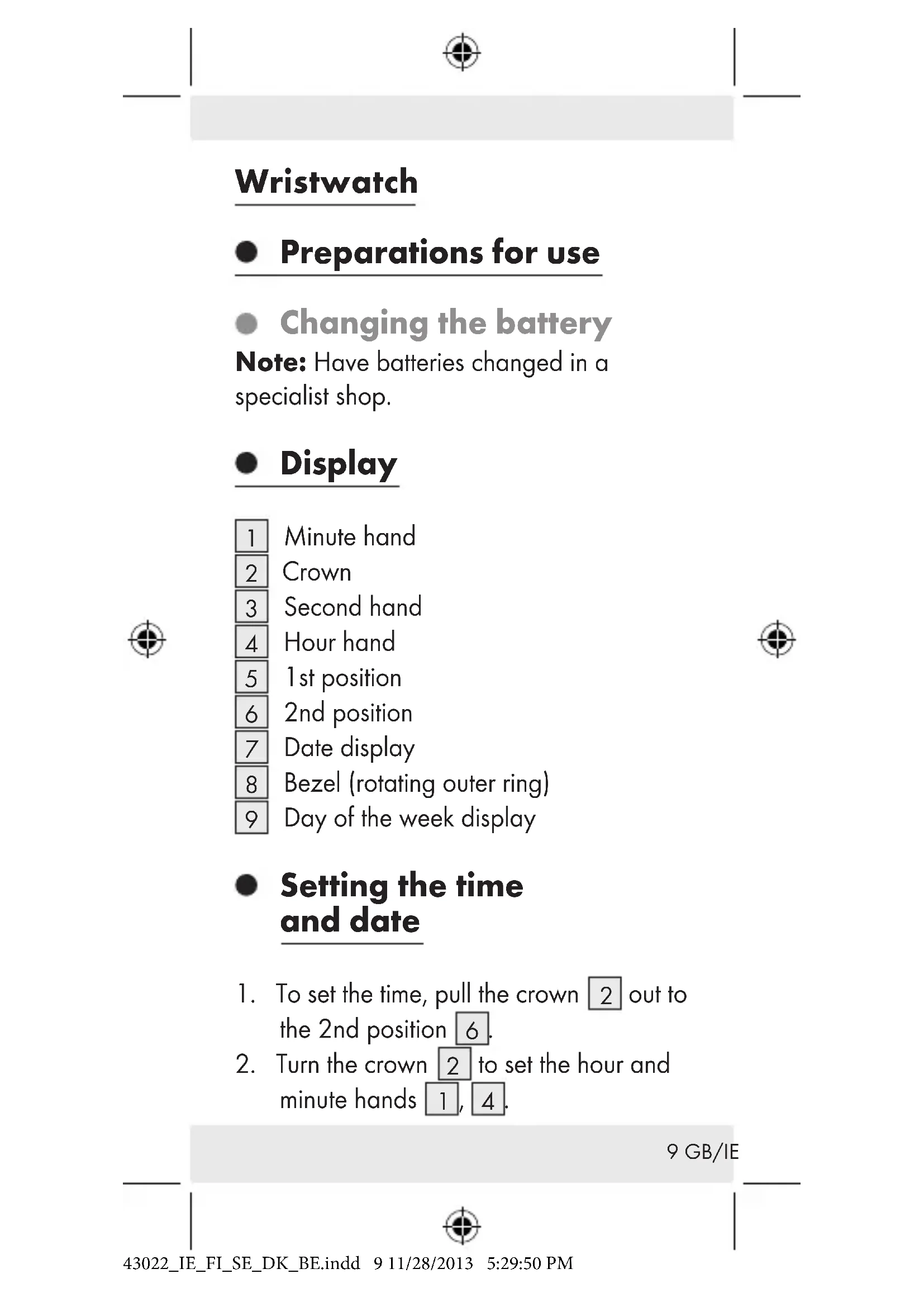 WARRANTY The device has been manufactured to strict quality guidelines and meticulously examined before delivery. In the event of product defects you have legal rights against the retailer of this product. Your legal rights are not limited in any way by our warranty detailed below. 43022_IE_FI_SE_DK_BE.indd 14 11/28/2013 5:29:50 PM15 GB/IE The warranty for this device is 3 years from the date of purchase. Should this device show any fault in materials or manufacture within three years from the date of purchase, we will repair or replace it - at our choice - free of charge to you. The warranty period begins on the date of purchase. Please keep the original sales receipt in a safe location. This document is required as your proof of purchase. This warranty becomes void if the device has been damaged or improperly used or maintained. The warranty applies to faults in material or manufacture. This warranty does not cover product parts subject to normal wear, thus possibly considered consumables (e.g. batteries) or for damage to fragile parts, e.g. switches, rechargeable batteries or glass parts. The warranty further excludes a reduction in water tightness. The state of water tightness is not a permanent property and should therefore be regularly maintained. 43022_IE_FI_SE_DK_BE.indd 15 11/28/2013 5:29:50 PM16 GB/IE Please note, opening and repairs performed by unauthorized individuals will void any warranty. 43022_IE_FI_SE_DK_BE.indd 16 11/28/2013 5:29:50 PM17 FI Rannekello