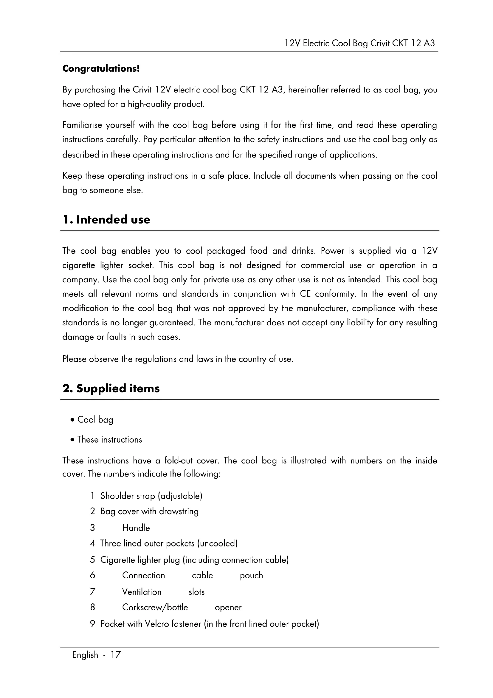 13. Warranty and servicing advice ................................................................... 2712V Electric Cool Bag Crivit CKT 12 A3 English - 17 Congratulations! By purchasing the Crivit 12V electric cool bag CKT 12 A3, hereinafter referred to as cool bag, you have opted for a high-quality product. Familiarise yourself with the cool bag before using it for the first time, and read these operating instructions carefully. Pay particular attention to the safety instructions and use the cool bag only as described in these operating instructions and for the specified range of applications. Keep these operating instructions in a safe place. Include all documents when passing on the cool bag to someone else.