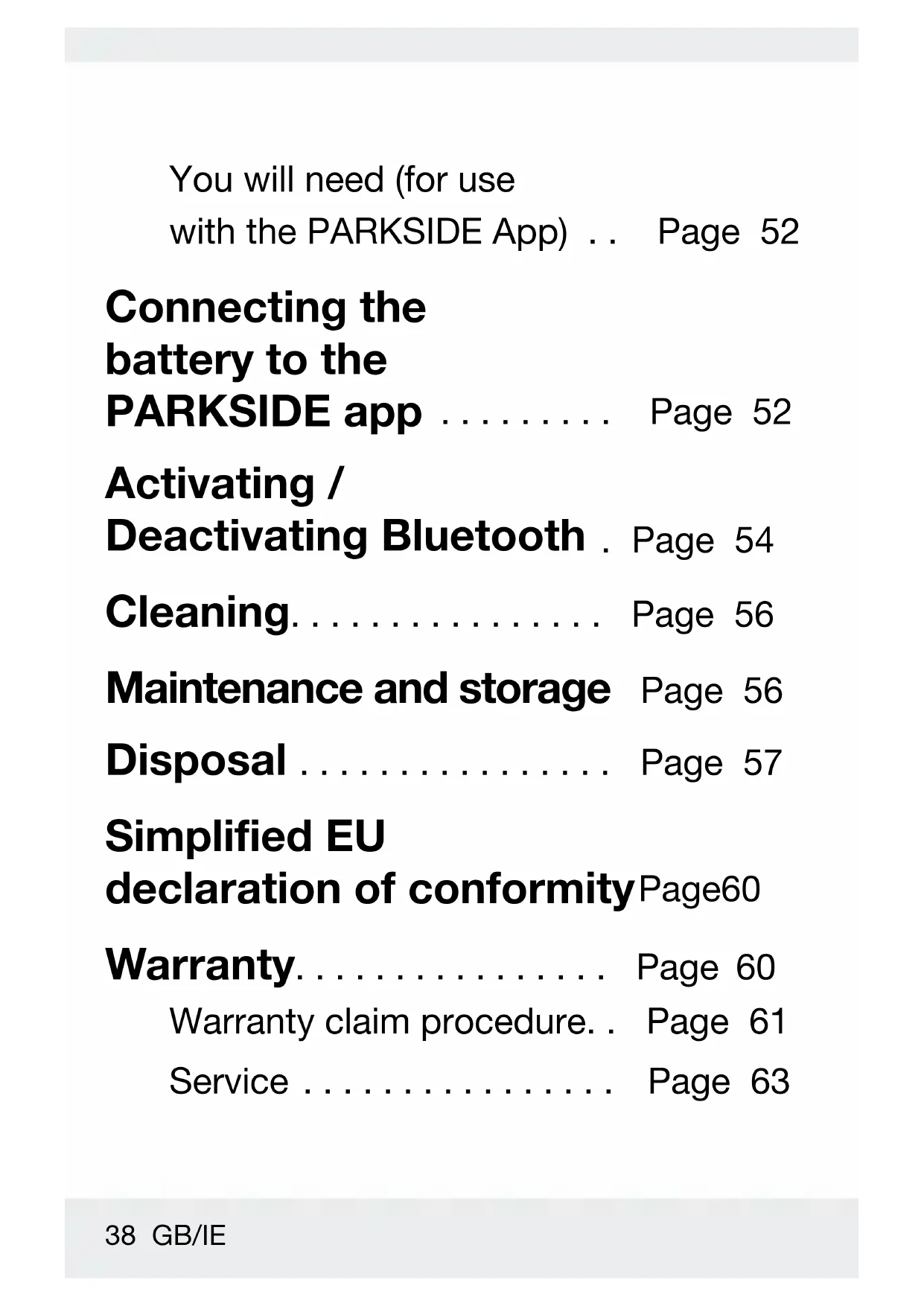 CAUTION! RISK OF INJURY! Only insert the rechargeable battery once the battery operated tool is ready for use. o To insert the rechargeable battery [2], place it on the guide track and push it into the charger [6]. The rechargeable battery audibly snaps into place. o To remove the rechargeable battery from the charger, press the rechargeable battery release button [1] and pull out the rechargeable battery.52 GB/IE The PARKSIDE app can be used with this product when a PARKSIDE Smart Battery is installed. You will need (for use with the PARKSIDE App) Mobile device: iOS 17.0 or higher Android 8.0 or higher Connecting the battery to the PARKSIDE app Only Smart batteries can be connected to the PARKSIDE app