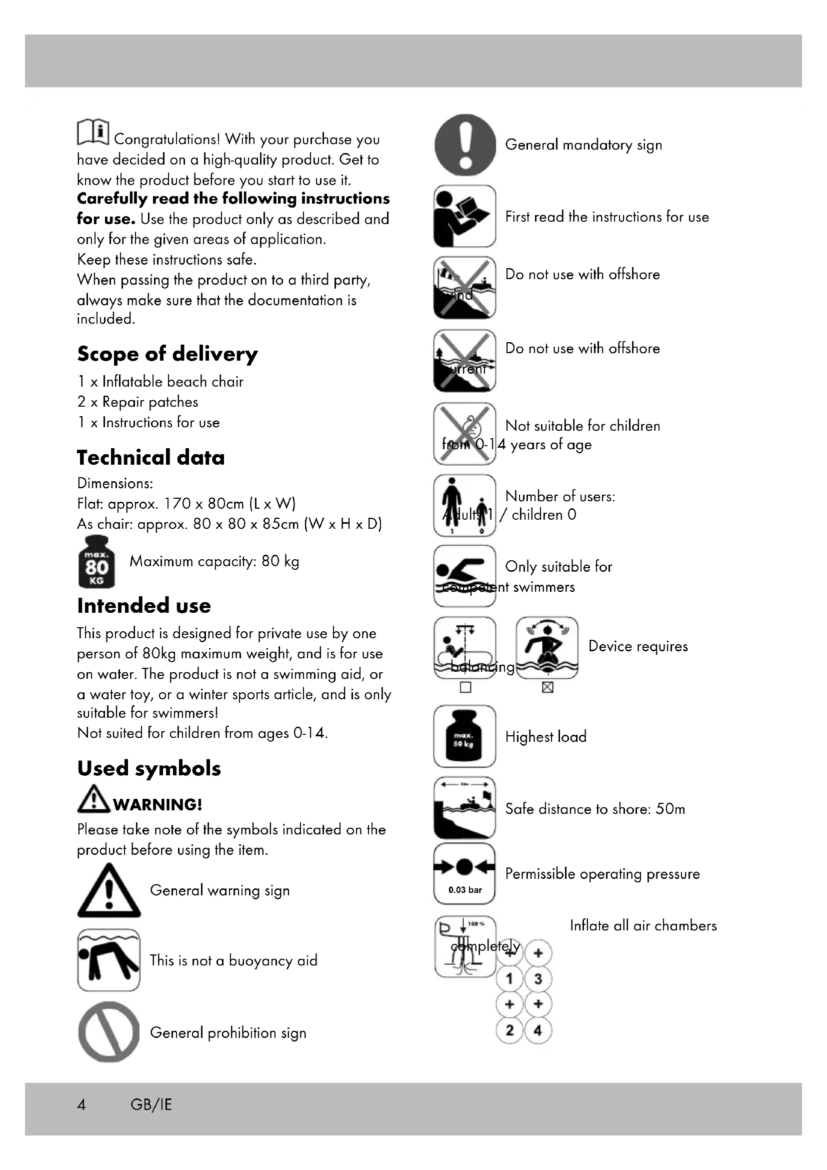 Permissible operating pressure Inflate all air chambers completely GB/IE5GB/IE Safety instructions CAUTION! There is a risk of tipping, drifting or drowning if these instructions are not followed. Uneven distri- bution of load on the article will cause tipping. WARNING! Risk of suffocation for children! Do not allow children to play with the packaging material or the product without supervision. WARNING! MORTAL DANGER! Will not protect against drowning! For swimmers only! CAUTION! The air chambers can be pushed below the water surface during ascending. Due to this reason and as well as due to single- sided loading the product can tilt. Risk of injury!