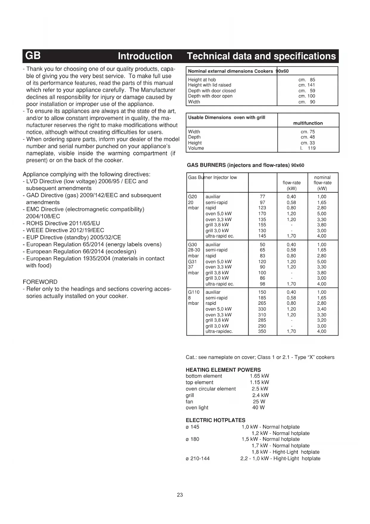 EQUIPMENT All models are equipped with safety device for oven and grill burners. Depending on the models, cooker may also have: - Safety device for one or more hob burners - Electric ignition on top burners - Electric ignition on oven and grill burners - Oven thermostat - Electric oven lighting - Rotisserie - Grill burner - Mechanical timer - Electronic timer For the LAYOUT OF HOB BURNERS see the models illustrated in figure 1 at the back of this manual. For the ELECTRIC WIRING DIAGRAM see figure 2 at the back of this manual. The electrical power is stated on the nameplate visible inside the warming compartment (if present) or on the back of the cooker. A copy of the nameplate is glued to the cover of this manual. Useful information concerning the energy consumption of electric ovens. This information completes and expands on the figures provided on the technical data sticker supplied with the instruction manual. Cooker 96N Multifunction EU environmental quality mark No Time required to cook a normal load in conventional mode in minutes. 61,6 Time required to cook a normal load in fan mode in minutes 81,6 Power consumption in stand-by setting in Watts. ... Usable area of the dripping pan in cm